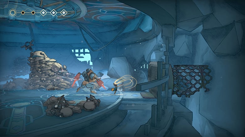 Художественный стиль игры – это прекрасное сочетание 3D и 2D, использующее cel-shading, который остается визуально привлекательным на протяжении всей игры. Он идеально передает ощущение исследования сломанной, опасной космической станции, и эта атмосфера умело интегрирована в платформер – вам предстоит прыгать по сломанным трубам и обломкам. Игра поддерживает сильное ощущение погружения, заставляя платформы казаться естественной частью окружающей среды, при этом четко показывая, по чему можно прыгать. Мне также понравила цветовая схема; каждая область имеет свою собственную, отличительную и запоминающуюся палитру.