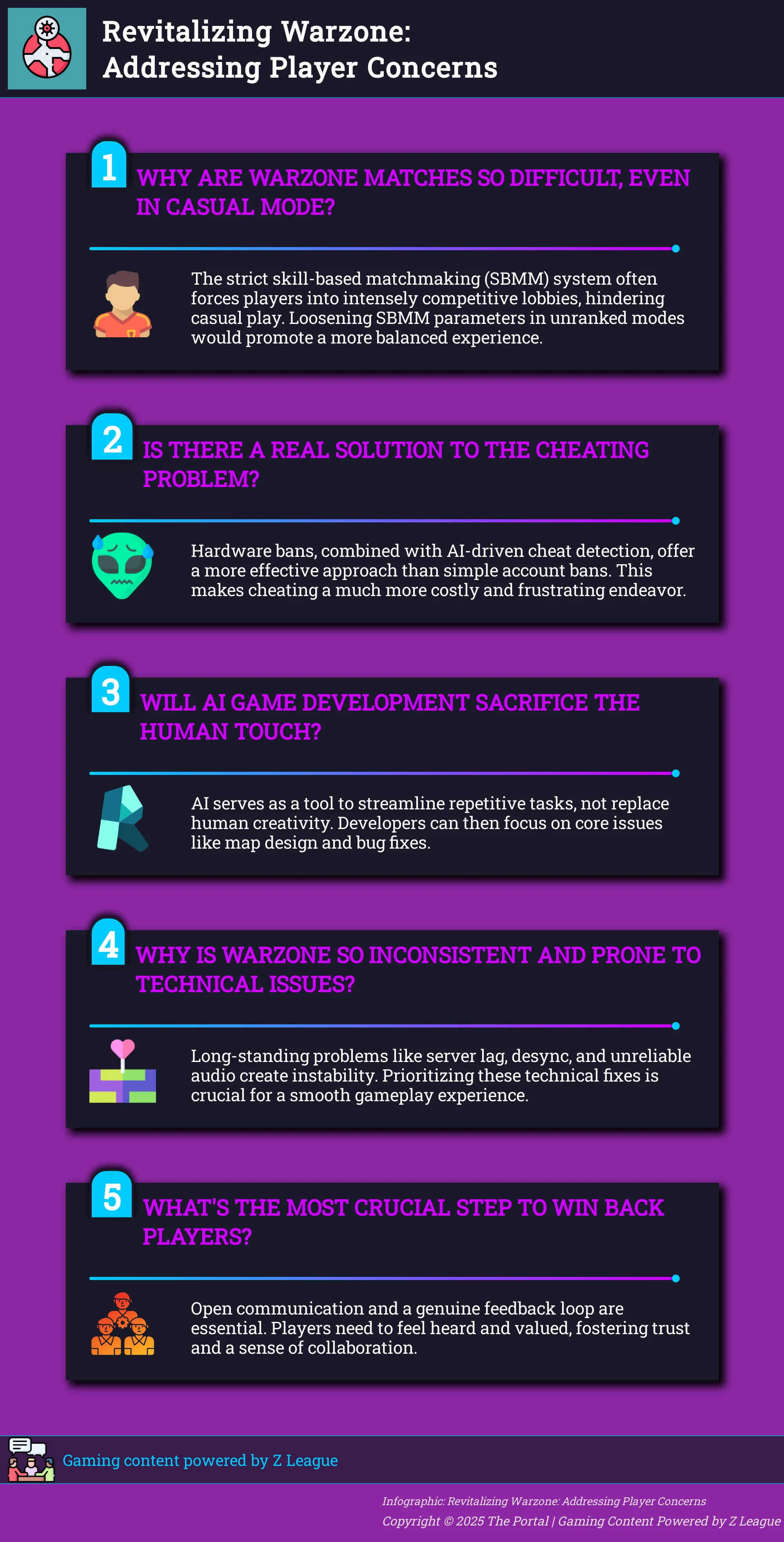 Общеизвестно, что Warzone, несмотря на захватывающие моменты, похоже теряет популярность среди игроков. Игровое сообщество обсуждает идеи, жалобы и искреннее желание вернуть игре былую славу. Так что же может действительно привлечь игроков обратно и гарантировать их регулярное возвращение? Вопрос не только в одном большом изменении, а в серии значительных улучшений, которые решают основные проблемы, с которыми сталкиваются игроки ежедневно. От проблематичного подбора игроков до повторяющейся системы вооружения — вызовы очевидны, равно как и возможные способы их устранения.