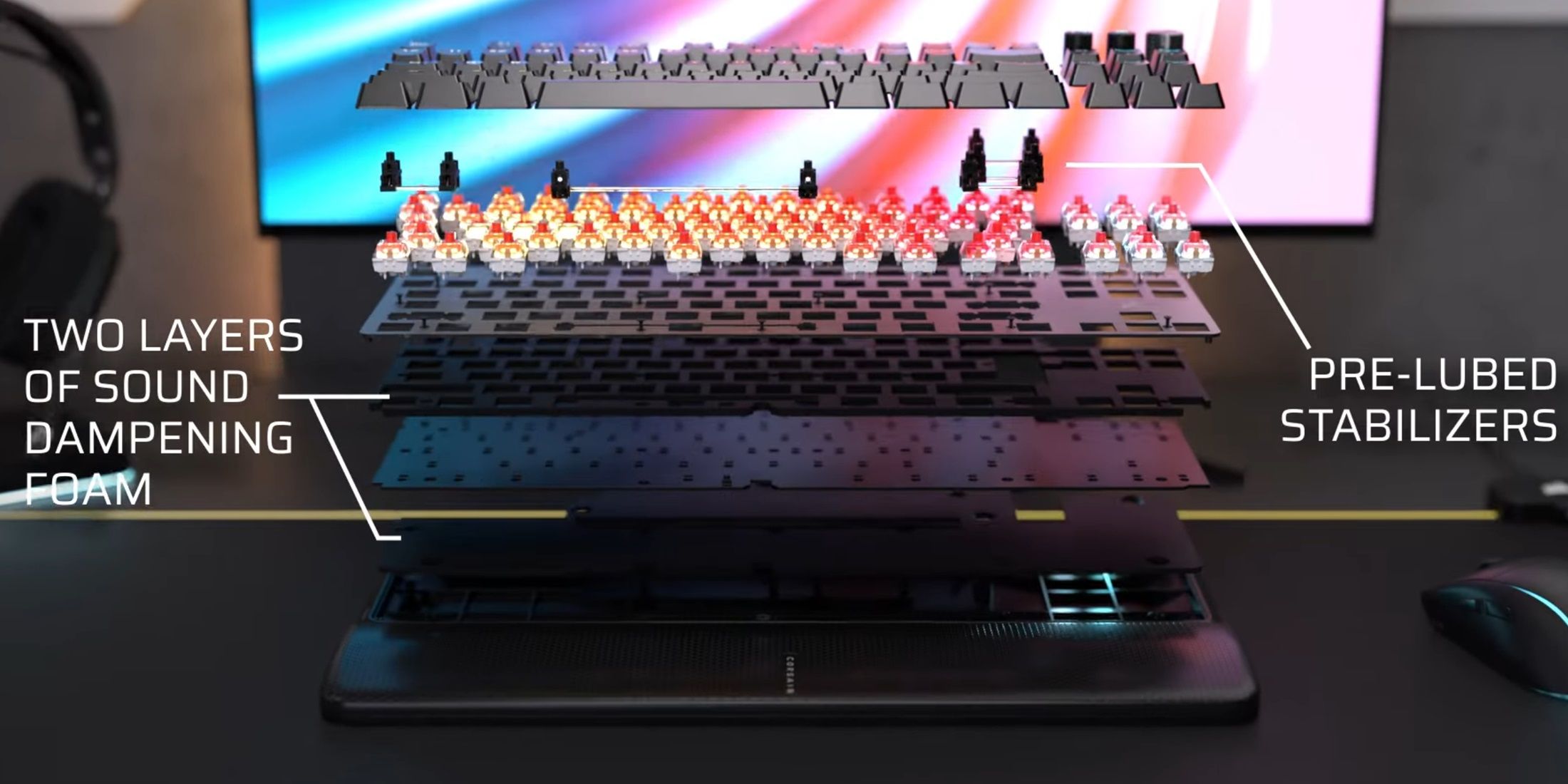 Беспроводная клавиатура Corsair K70 Core TKL не поддерживает горячую замену и не предлагает расширенных возможностей настройки. Но он тщательно разработан для снижения шума и оснащен только красными линейными переключателями. Эти переключатели поставляются предварительно смазанными и имеют усиленные стержни для бесшумной работы и меньшего раскачивания клавиш. Чтобы еще больше повысить тишину, Corsair добавила слои звукопоглощающего пенопласта — особенность, которую часто ценят энтузиасты.