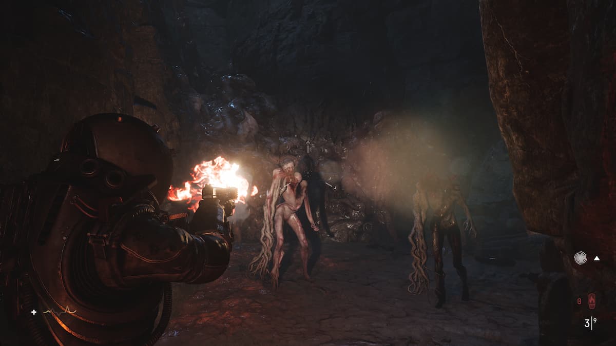 Противники наносят сильные удары и редко теряют равновесие. Поначалу бои казались сложными, так как мои атаки казались неэффективными, возможно, из-за ожиданий от Dead Space, где фокусировка на конечностях играет ключевую роль. Однако, хотя прицеливание в ноги остается разумным, вам нужно наращивать силу своих выстрелов, если вы хотите, чтобы эти враги, или ‘Сироты’, как их называет игра, пошатнулись.