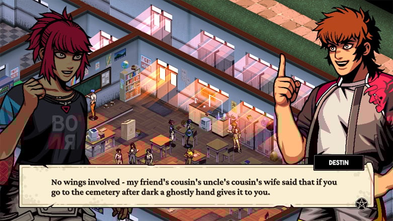 Бесплатный телеграм-каналВизуальная составляющая игры действительно впечатлила. Demonschool обладает уникальным рисованным стилем, сочетающим детализированные 2D-портреты персонажей с пиксель-артом. Общий внешний вид и ощущение я бы описал как ‘академический гот начала 2000-х’ – он сильно напоминает мне о бунтарском подростковом возрасте, наполненном энергией скейтбординга, стилем Hot Topic и мирами игр, таких как Kingdom Hearts и Persona. Это очень самобытная эстетика, во многом вдохновленная японскими медиа, и я абсолютно в восторге от неё.