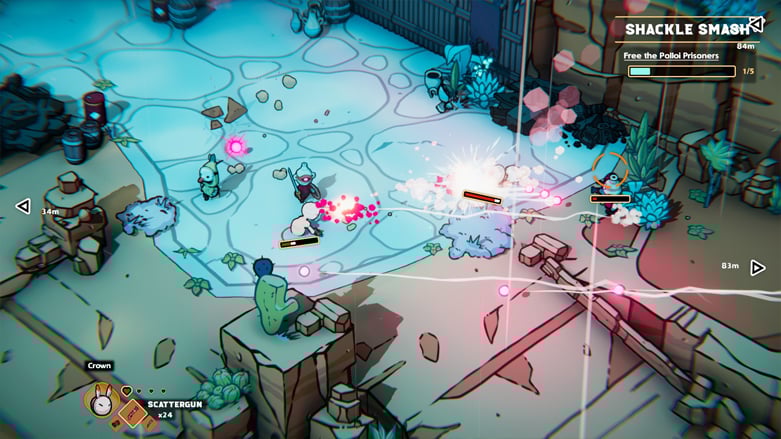 Между напряжёнными сражениями с крабами вы будете исследовать небольшие, похожие на подземелья области пешком, используя найденное оружие. Эти секции ощущаются как стремительный beat ’em up с множеством снарядов, которых нужно уклоняться. Даже на более высоких уровнях сложности они не были чрезмерно сложными, но я часто чувствовал себя подавленным, играя в одиночку, и желал, чтобы мне помог друг. Огромное количество врагов и постоянный поток быстрых, наносящих урон атак сделали управление выносливостью и эффективное уклонение крайне важными.