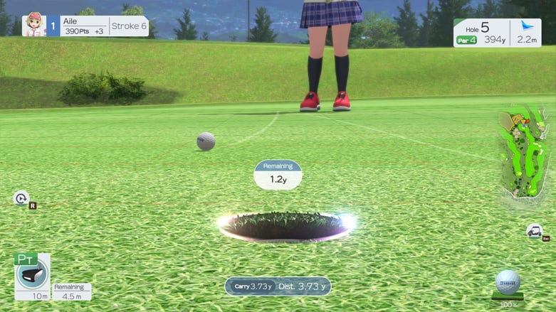 Мне особенно понравился инновационный подход к ударам по мячу в Everybody’s Golf Hot Shots. Вместо простой команды «Удар», игра превращает удар по мячу в мини-игру, основанную на времени реакции. Чтобы выполнить идеальный пат, вам нужно нажать кнопку на правильном расстоянии и направлении. Эта система, основанная на реакции, полезна, поскольку она выделяет конкретные точки на индикаторе, куда следует целиться, чтобы мяч попал в лунку. В отличие от других игр, которые заставляют вас играть с расплывчатыми оценками и цифрами, эта функция дает вам четкую цель, к которой нужно стремиться. После достижения правильного расстояния, задача продолжается, когда вы пытаетесь ударить по мячу по центру. Если вы ударите слишком далеко в любую сторону, это изменит направление движения мяча.
