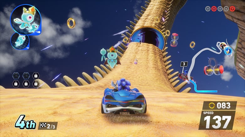 Главная особенность *Sonic Racing: CrossWorlds* — возможность переключать трассы прямо во время гонки. Примерно на середине дистанции появляется портал, который мгновенно переносит всех на совершенно новую трассу с другим внешним видом и атмосферой. Это неожиданное изменение поддерживает азарт гонок и дает отстающим игрокам шанс догнать и даже победить. Это добавляет много непредсказуемости в каждую гонку!