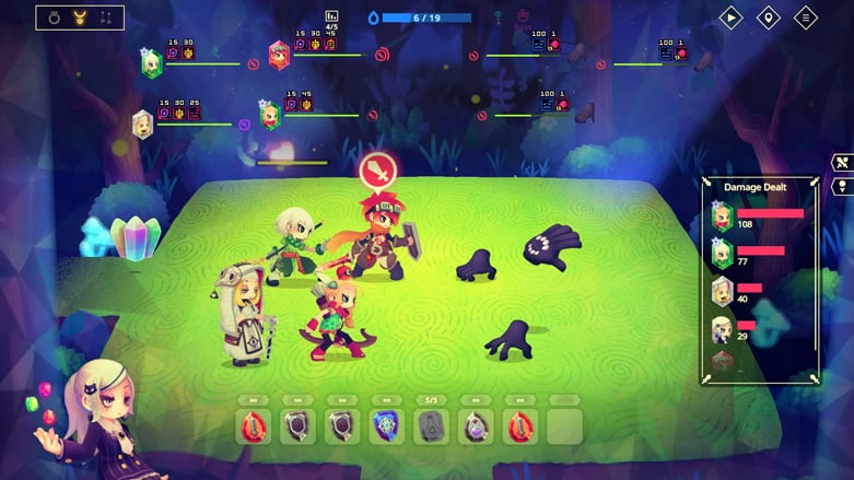 Игра сочетает в себе стратегию, позволяя вам строить как боевую команду, так и колоду карт, используя ‘gems’. Каждый gem призывает героя с особыми способностями, характеристиками и чертами, которые усиливаются, когда вы включаете в свою команду нескольких героев с одной и той же чертой. Вы можете сделать героев сильнее, собирая три одинаковых, чтобы улучшить их характеристики, или находя сферы, которые даруют им уникальные пассивные способности. Герои теряют здоровье во время сражений и при исследовании, но вы можете лечить их с помощью специальной валюты. Вы также можете потратить золото, чтобы купить больше героев или увеличить размер своей команды у торговцев.
