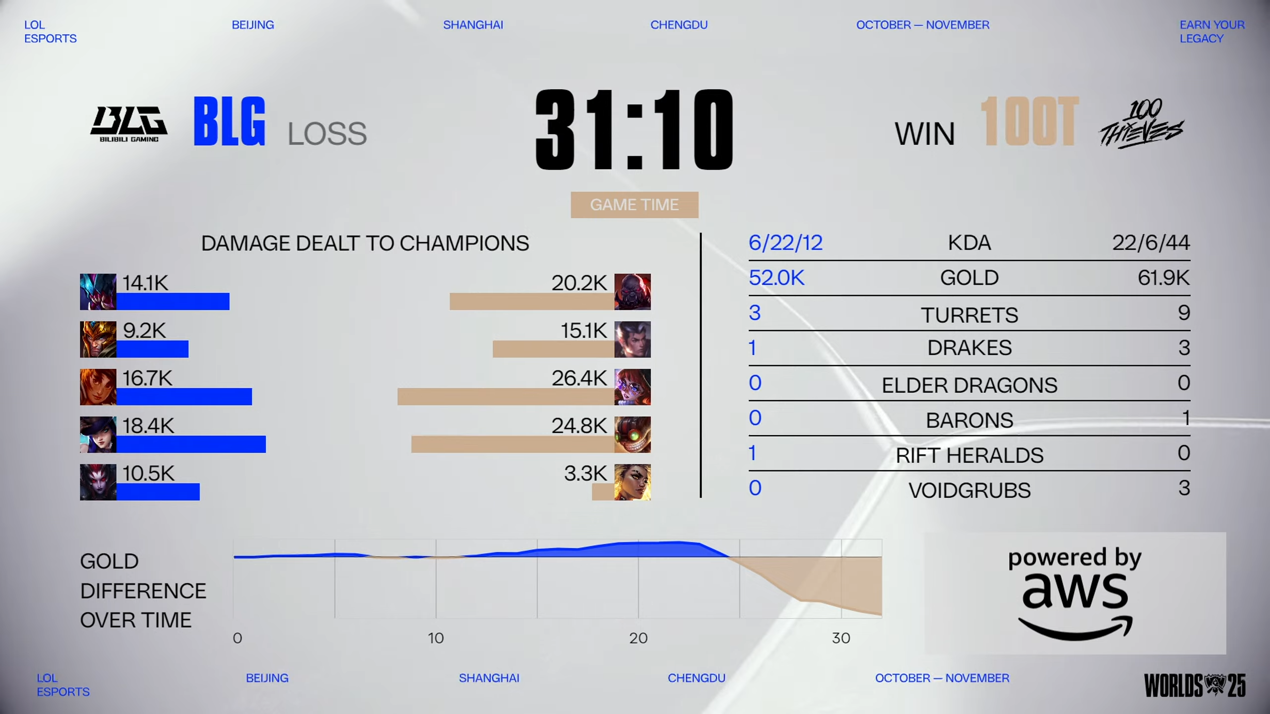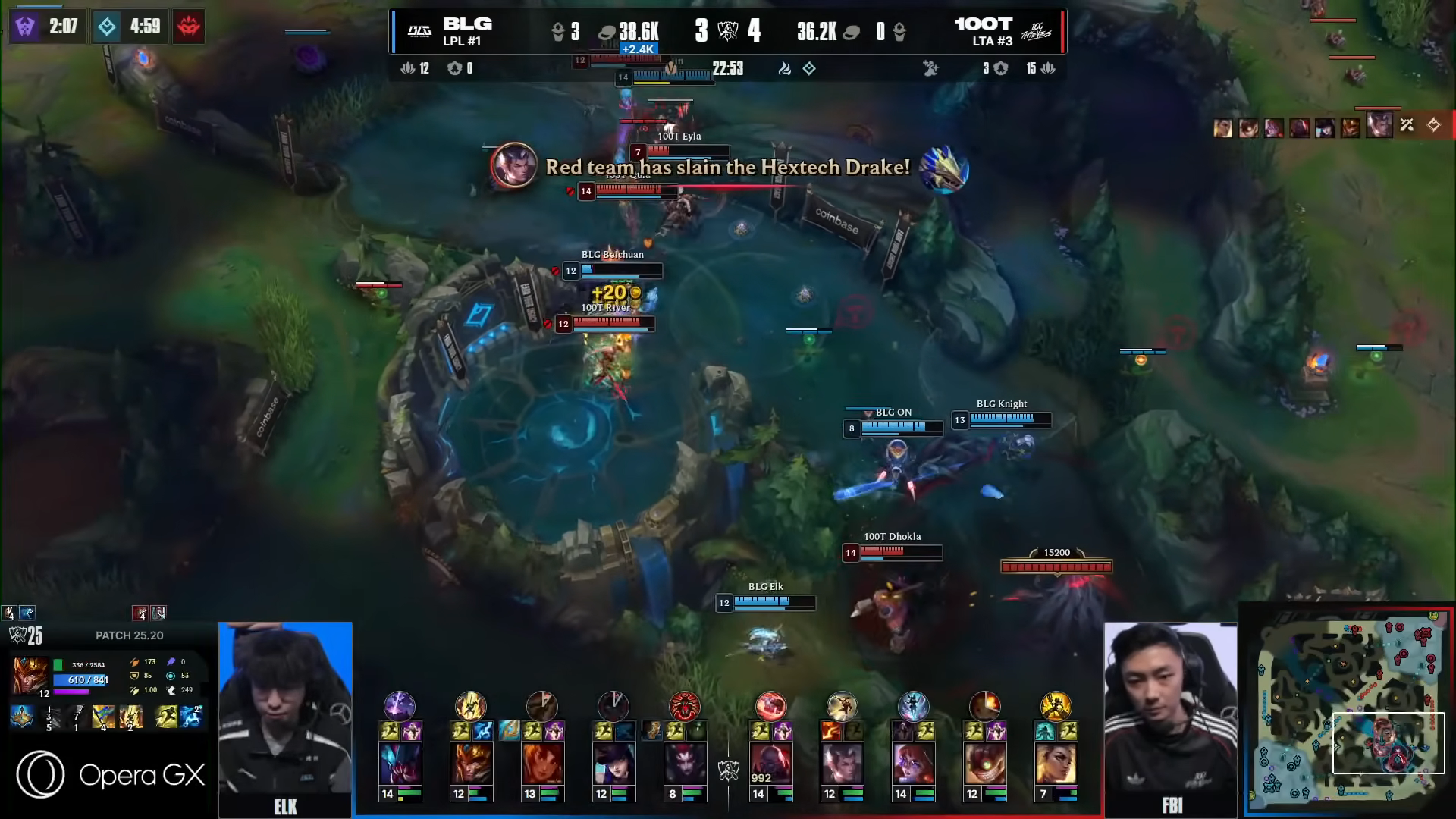 River агрессивно вступил в бой с противником, уничтожил дракона и создал брешь в обороне. Это привело к командной схватке, где Beichuan оказался окружён и подавлен. Bin оказался в ловушке, но сумел вытащить Eyla в безопасное место, пока они пытались сбежать. Тем временем, Dhokla впечатляюще сдержал трёх противников, позволив своей команде собраться и одержать решающую победу над BLG для 100 Thieves. Хотя Atakhan был быстро уничтожен, Beichuan увидел возможность, спровоцировав ещё один бой. К сожалению, Bin телепортировался прямо на территорию противника и был мгновенно повержен, а Knight также пал в последовавшем хаосе. Кажется, комментаторы едва спаслись.
