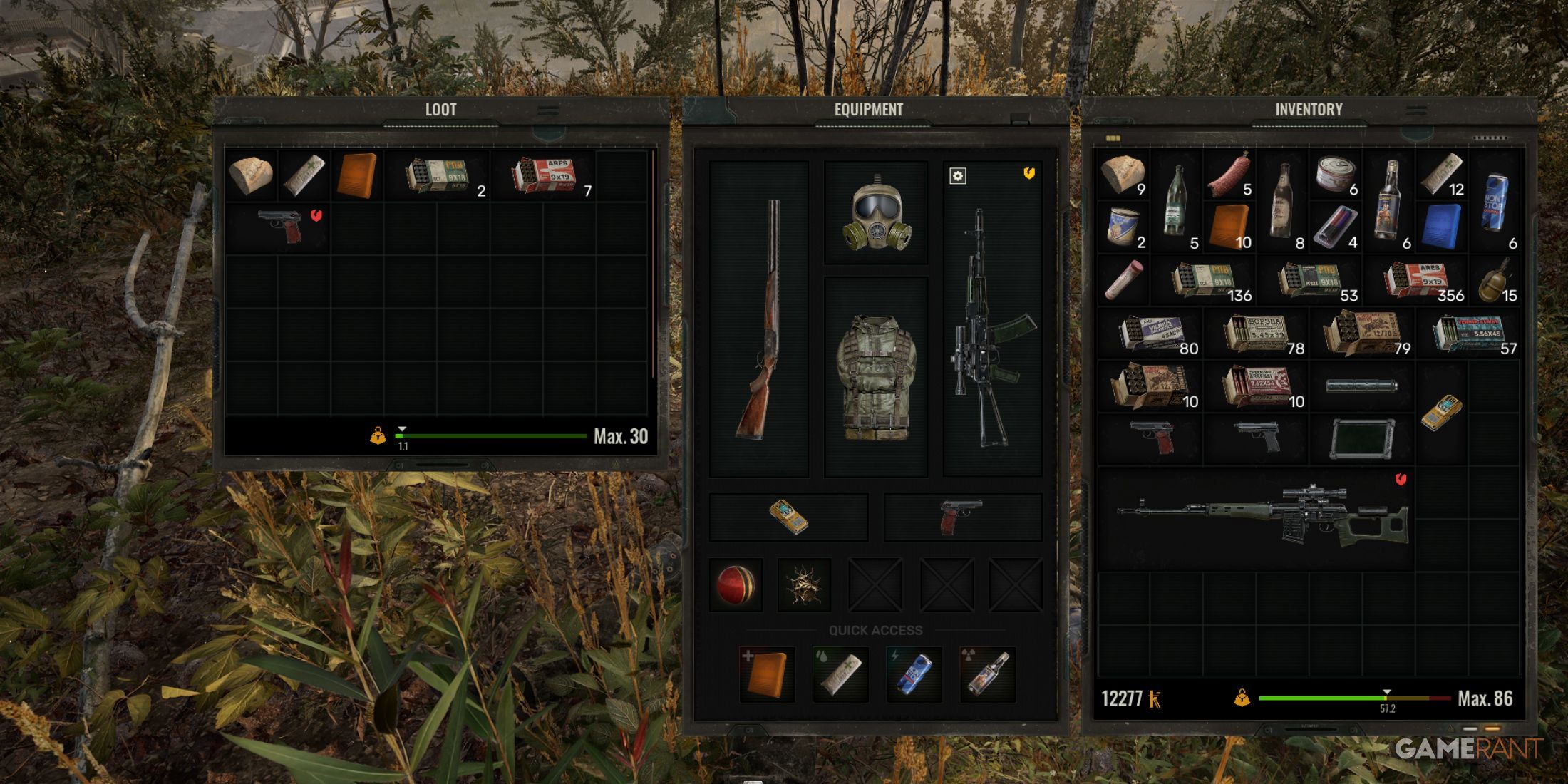 Игрокам важно сосредоточиться на ношении ценных предметов во время исследования, например, полезных предметов для личных нужд во время экспедиций или предметов, которые можно продать в поселениях. Таким образом, при входе в Зону в инвентаре сталкера должно быть приоритетное оружие, боеприпасы, лекарства и продукты питания высшего уровня.