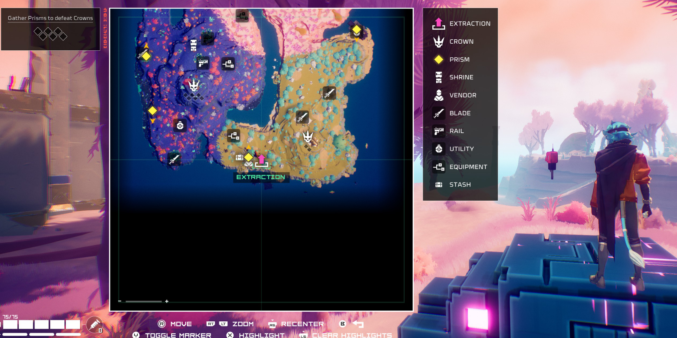 Как заядлый игрок, я бы посоветовал кому-нибудь начать эвакуацию в Hyper Light Breaker: «Сначала вам следует проверить карту Зарослей на наличие отчетливого значка. На этом значке есть красная стрелка, направленная вверх от белой линии. Это конкретное место — это ваша текущая точка извлечения Разрастания.