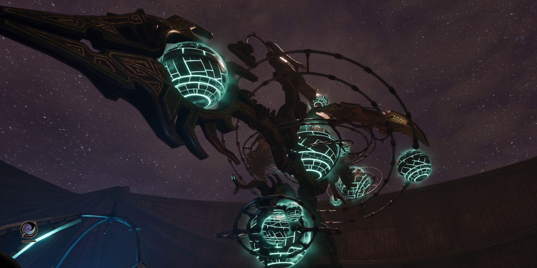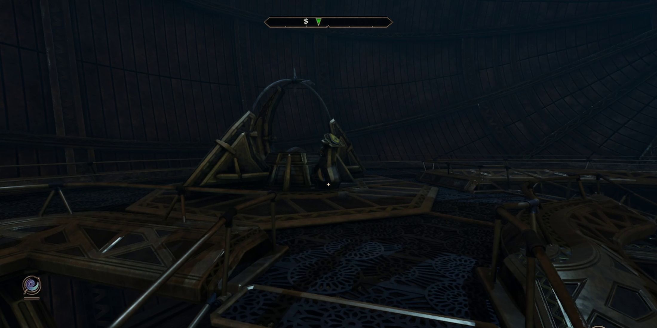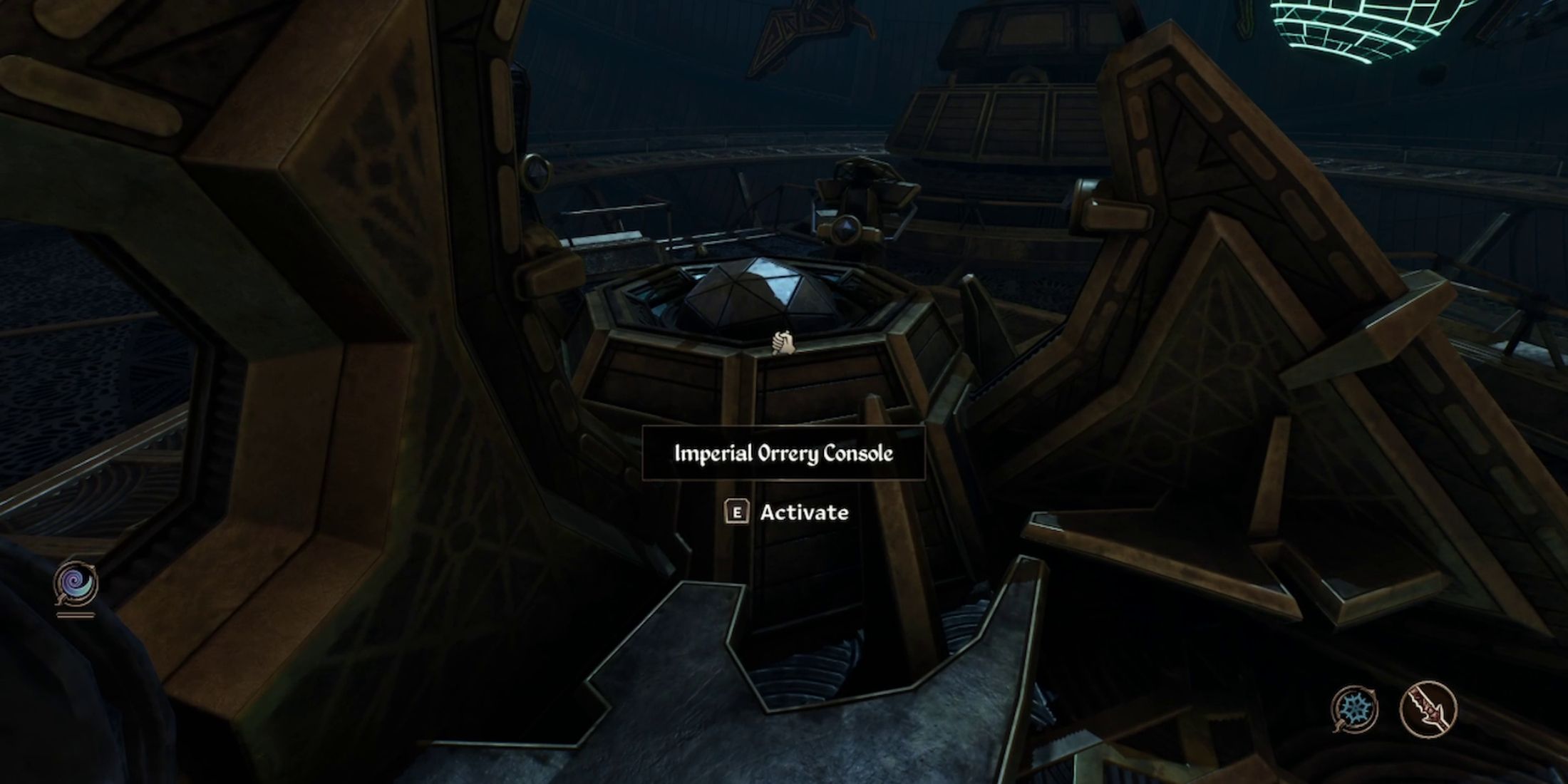 Когда вы войдете в Оррерий, поднимитесь по лестнице и взаимодействуйте с панелью управления имперским оррерием, чтобы привести его в движение. После активации панель загорится, окружающие барьеры опустятся, и из нее начнет исходить мягкое голубое сияние.