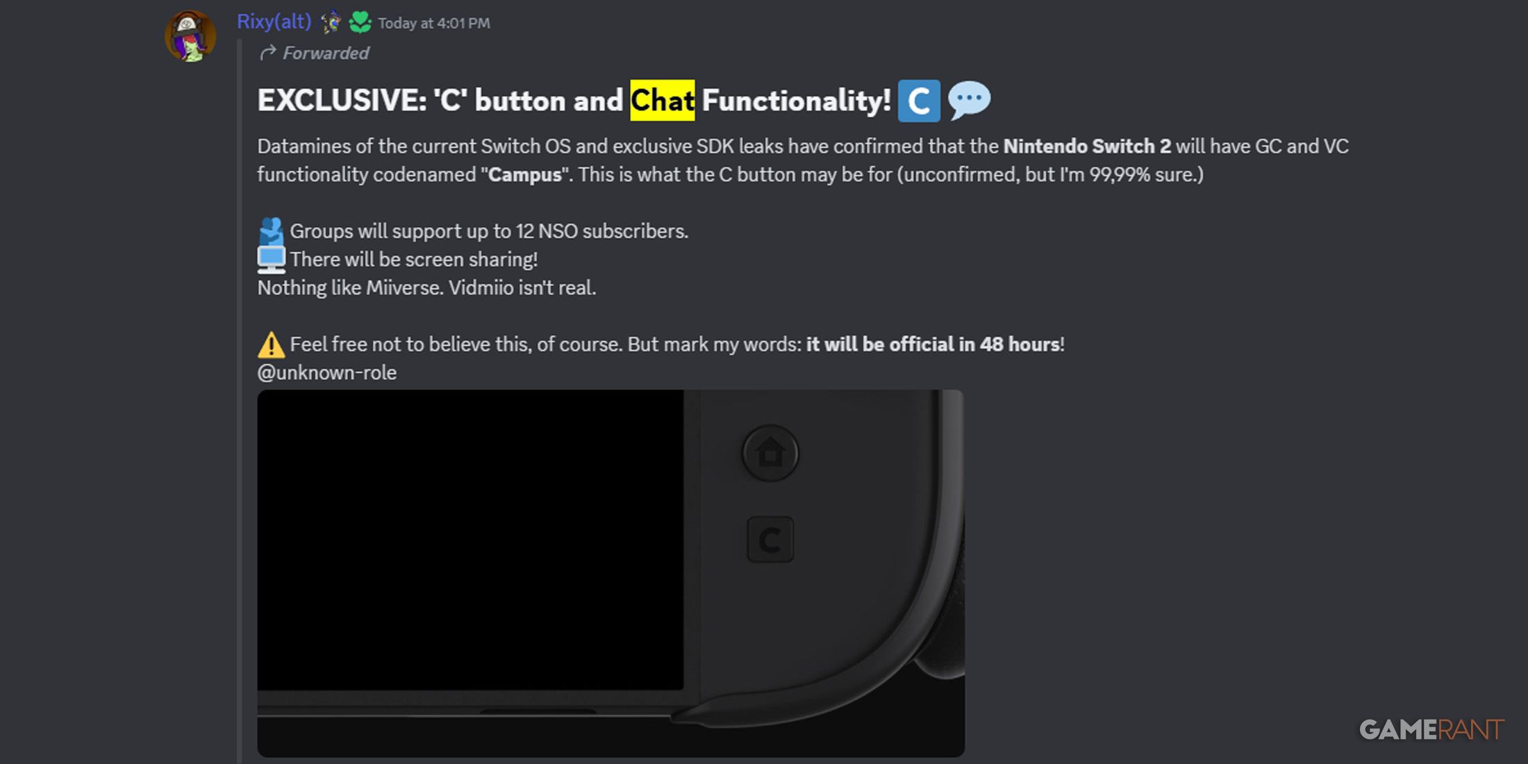 Тот же источник указывает, что, по слухам, функция Campus позволит совместно использовать экран и может содержать до 12 пользователей в группах чата. Интересно, что если эта предполагаемая функция связана с новой кнопкой на будущей консоли Nintendo, то более правдоподобным кажется то, что буква на этой клавише означает «чат», а не «Кампус». Эта разработка ставит под сомнение широко распространенную теорию фанатов, предполагающую, что кнопка C может использоваться для зеркального отображения экрана Nintendo Switch 2 на другом устройстве.