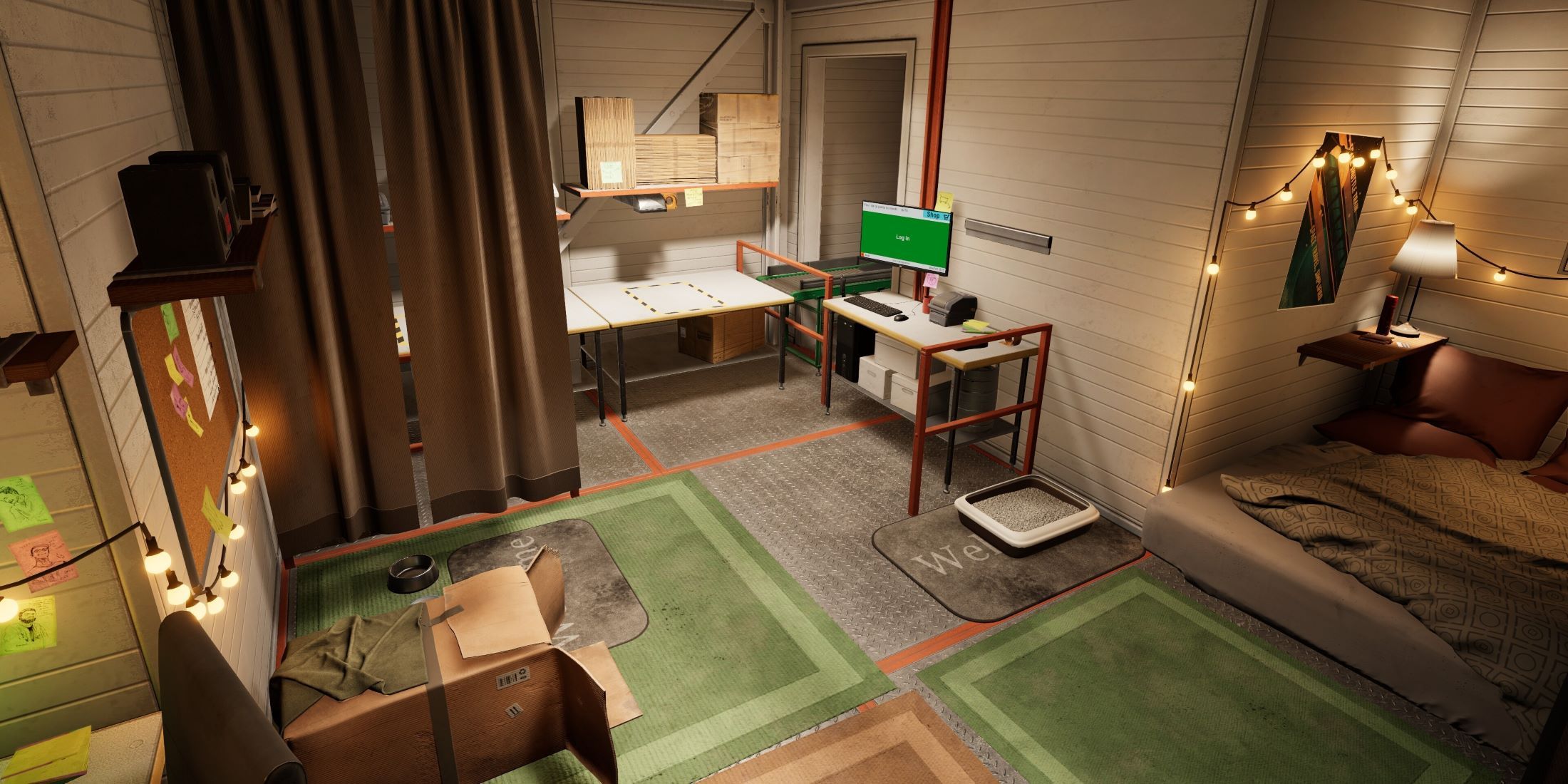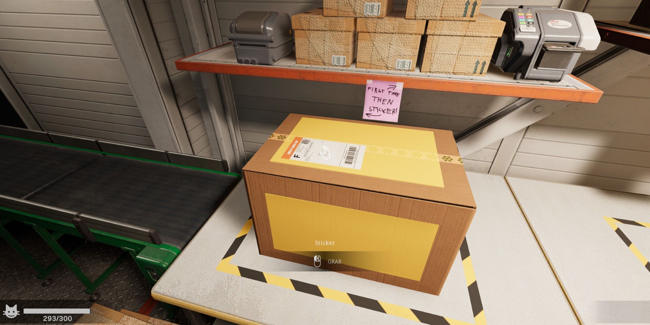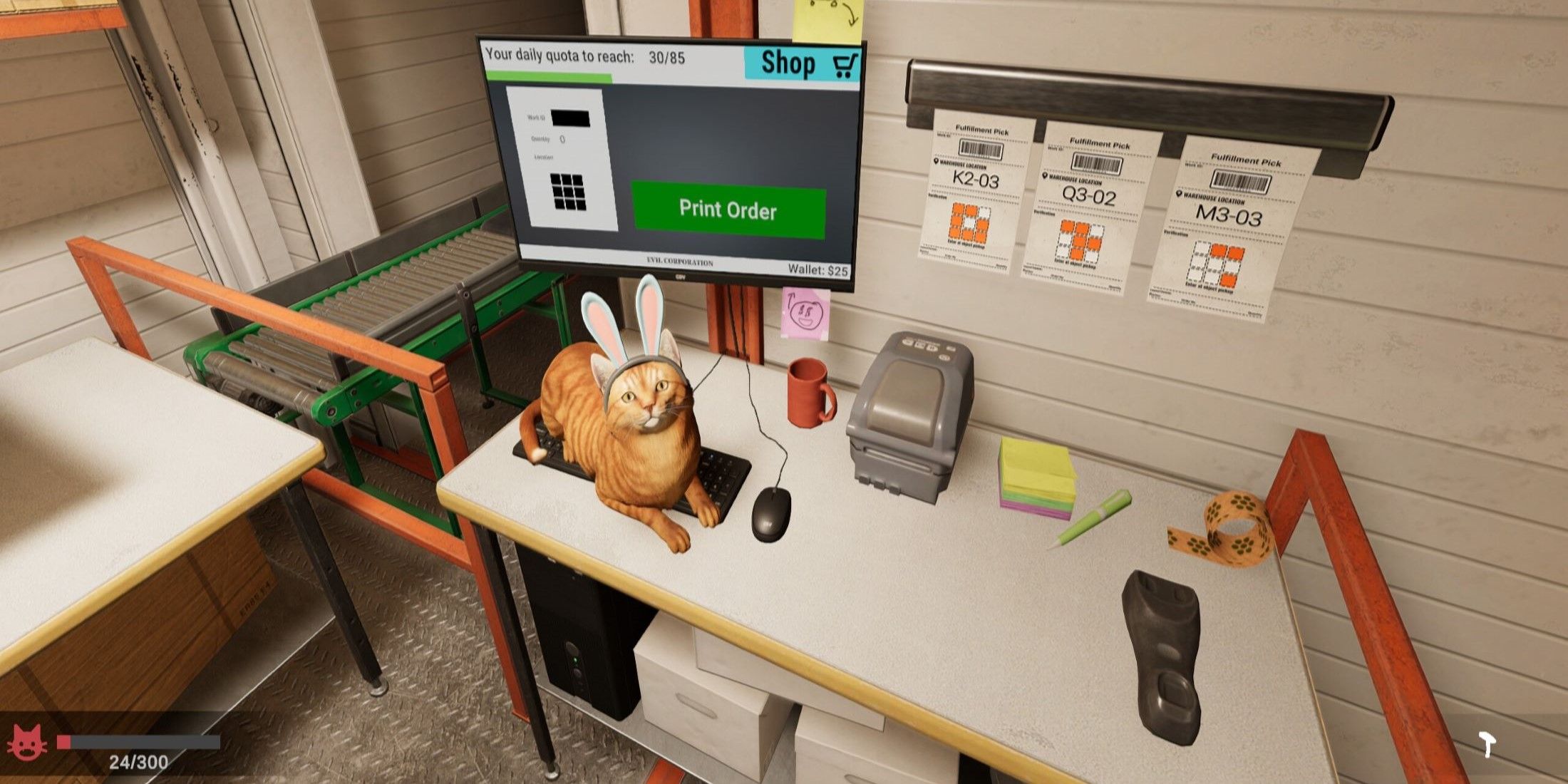 Главный герой должен доставить назначенные пакеты, чтобы накопить определённую сумму дохода, которую можно потратить на улучшения. Некоторые из этих улучшений — это беговые кроссовки, позволяющие перемещаться быстрее, устройство для отслеживания пакетов, которые он должен найти, а также необходимые апгрейды, чтобы удовлетворить своего кота во время исследования склада: еда, игрушки и уютная зона сна для питомца. Однако среди наиболе