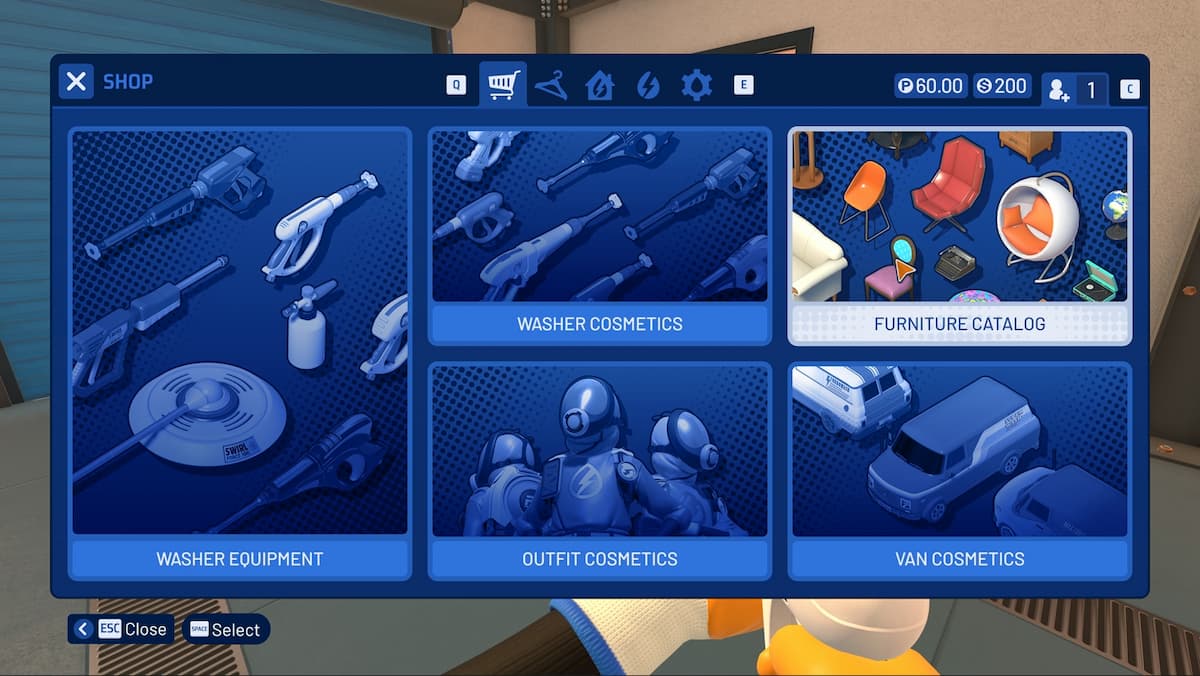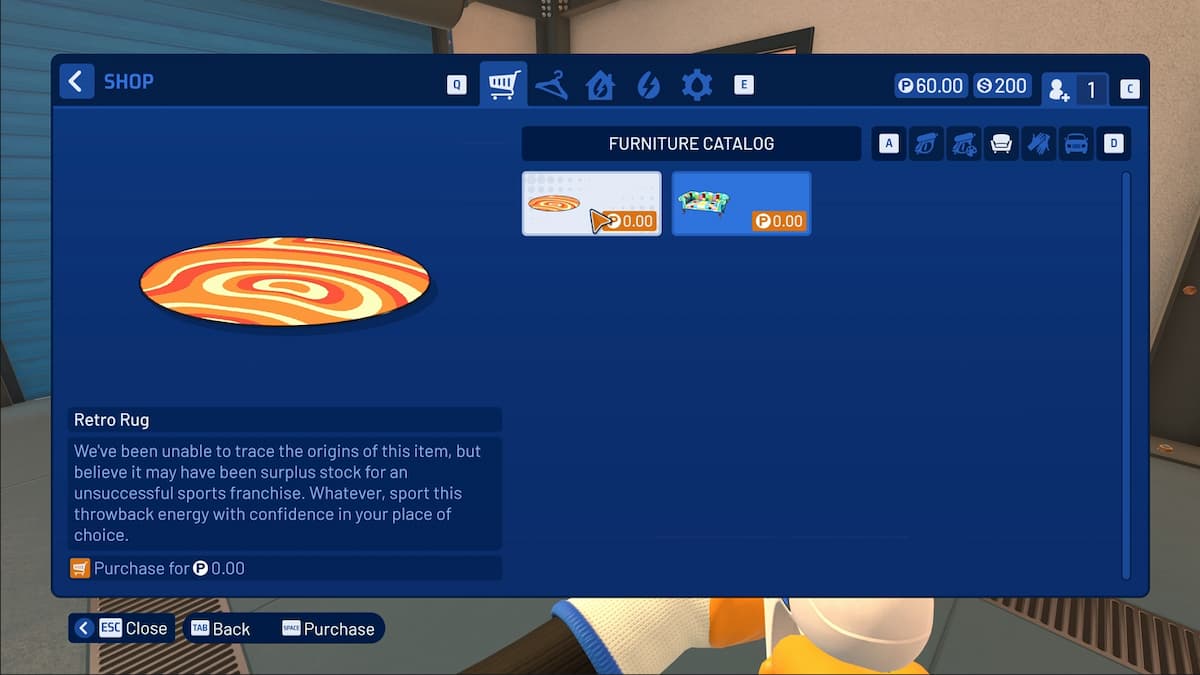 - Сначала нажмите Escape, чтобы открыть меню и выберите кнопку корзины, чтобы открыть магазин. Здесь, на вкладке каталога мебели, купите ковёр или диван. Они будут бесплатными.