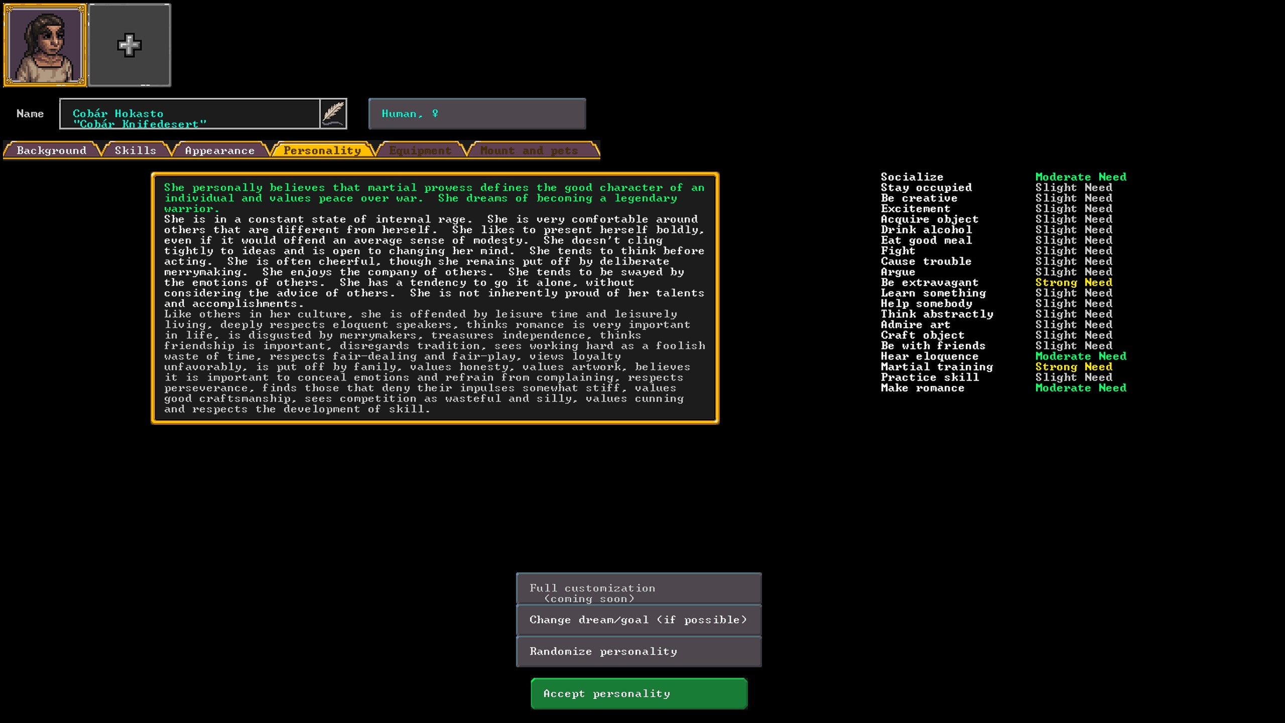 В Dwarf Fortress кастомизация персонажа тщательная и многогранная. Для начала мы создаем предысторию, которая влияет на фундаментальные навыки, отношения и открытие квестов. Далее, визуальное представление нашего персонажа возникает из генетических черт близлежащего населения, видимых в новых процедурно созданных портретах и описаниях персонажей. В зависимости от выбранного уровня сложности мы выделяем гибкий бюджет очков атрибутов и навыков для более чем 400 вариантов, таких как Память, Социальное восприятие, Музыкальные способности или Укус. Хотя многие из них говорят сами за себя, новички в игре могут обратиться к ресурсам за разъяснениями по применению определенных характеристик во время создания персонажа.