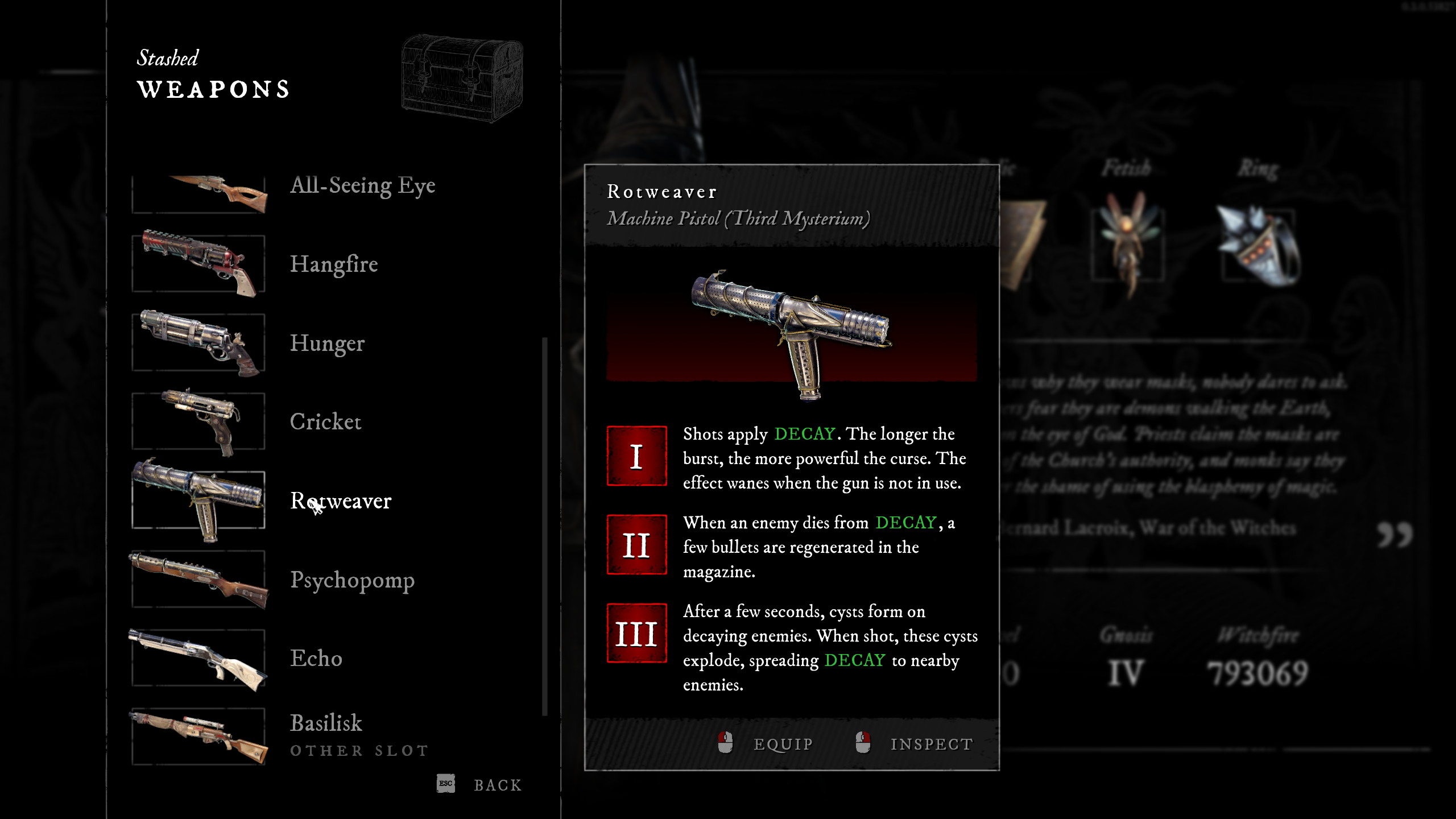 Возможно, даже более важным, чем повышение уровня, развитие Мистериума каждого оружия является величайшим усилением силы в бою. Каждое оружие Witchfire имеет ряд задач, которые игроки должны выполнить, чтобы раскрыть свой потенциал, или Mysterium, и на основе этих характеристик оружия могут быть основаны целые сборки. Безобидный пистолет-пулемет может стать разрушающим инструментом разрушения, вызывающим образование на врагах пригодных для стрельбы кист, которые взрываются и распространяются на ближайших врагов, в то время как ручная пушка может начать стрелять пулями, которые попадают во врагов и взрываются при перезарядке.