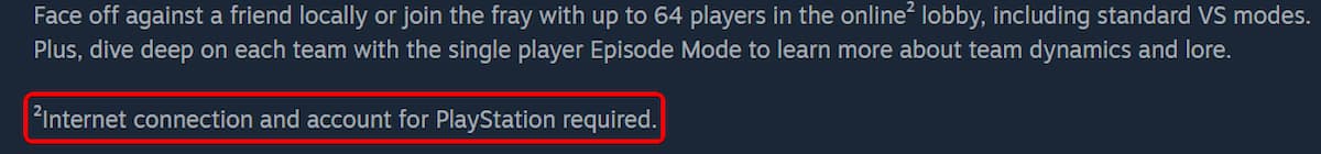 Страницы в Steam и Epic Games Store указывают, что для игры онлайн или участия в матчах с участием до 64 игроков требуется учетная запись PlayStation. Вот скриншот, демонстрирующий это требование в Steam.