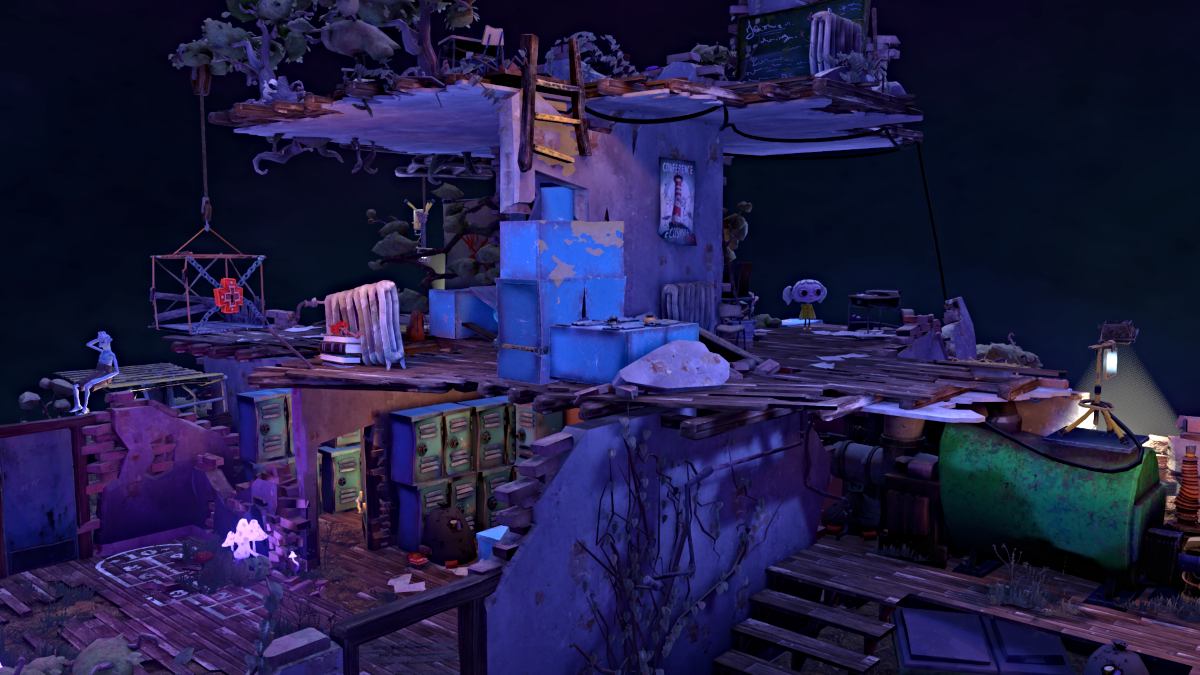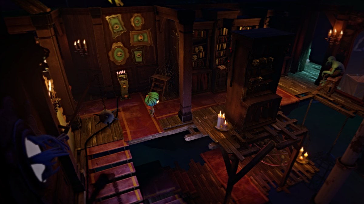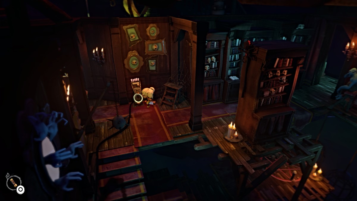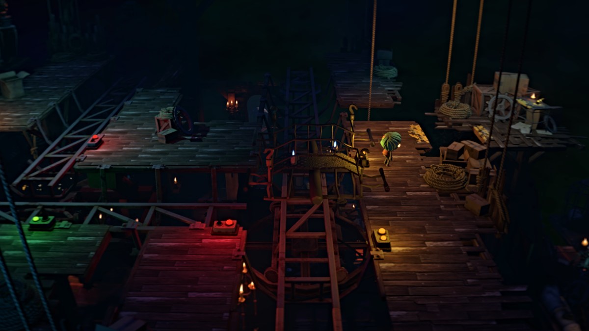 Затем камера переместится вверх, к чердаку дома, где вы увидите большую головоломку. Обратите внимание на красные и зеленые огни — они показывают, какие части можно вращать и перемещать.