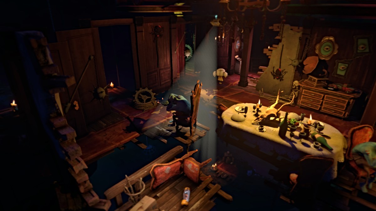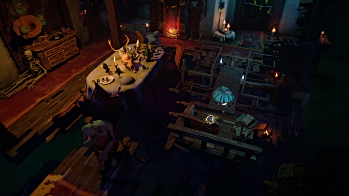 Ладно, я спрыгнул в эту дыру и приземлился в чём-то вроде столовой. Дядя Нены здесь, и он явно что-то замышляет, разговаривая с двумя другими мужчинами. Мне нужно быть предельно осторожным и избегать его поля зрения. План таков: подползти под стол и добраться до другой стороны комнаты незамеченным!