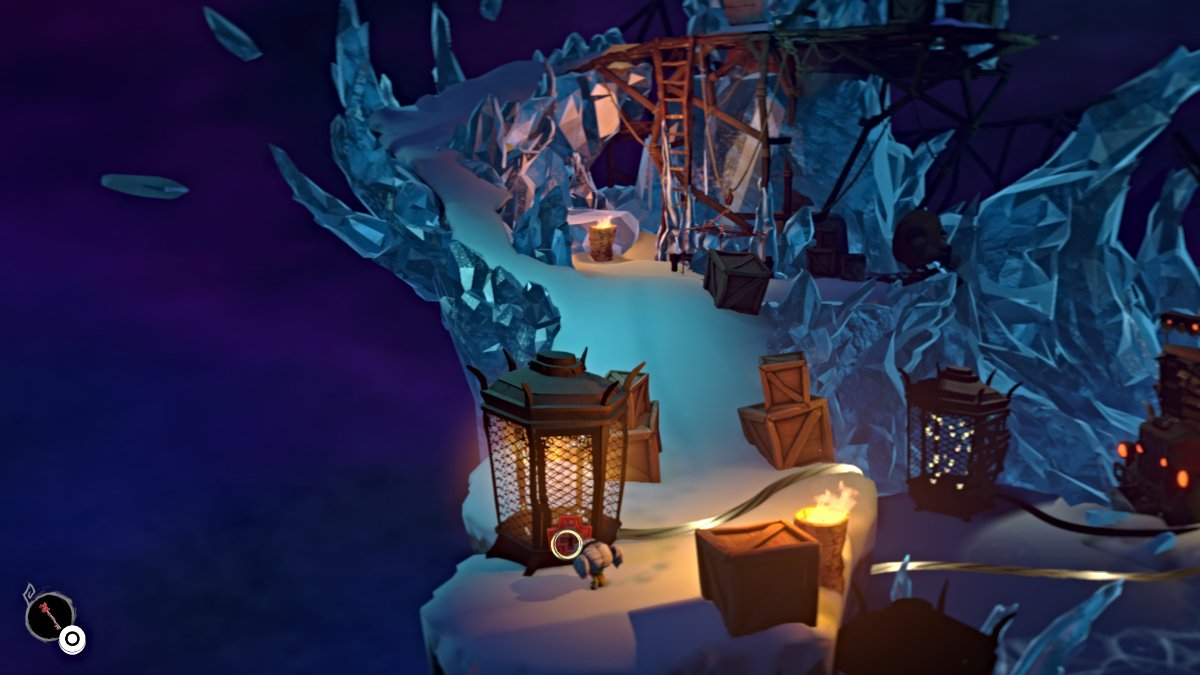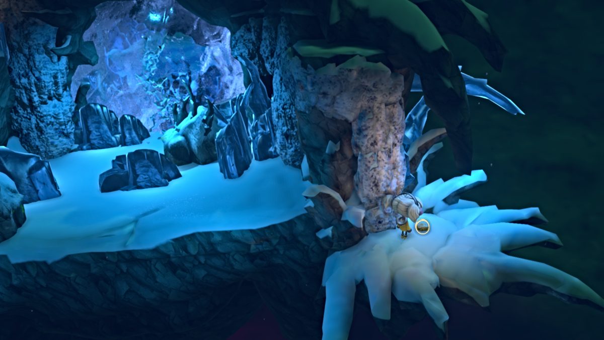 Последний жёлтый камень находится справа. Сначала попросите Мрачного толкнуть самый нижний ледяной камень влево. Затем попросите Нену взобраться по стене, чтобы добраться до платформы с жёлтым камнем.