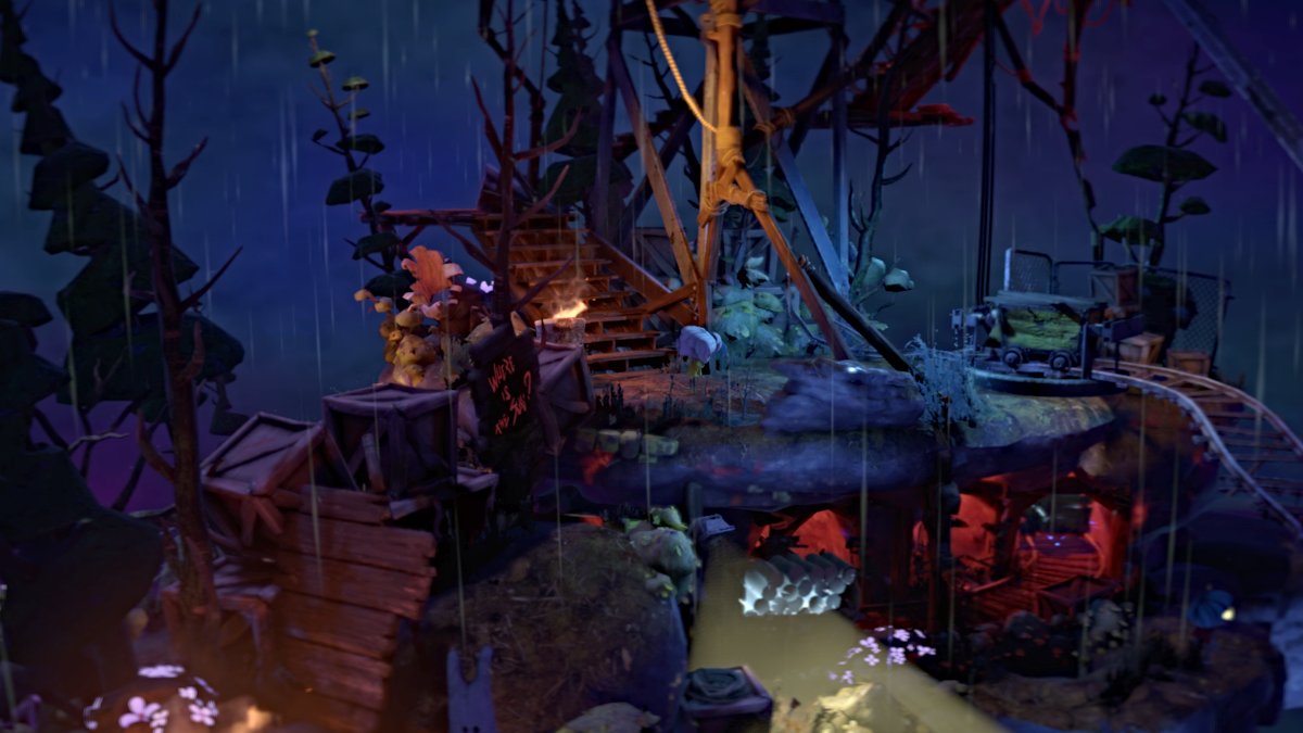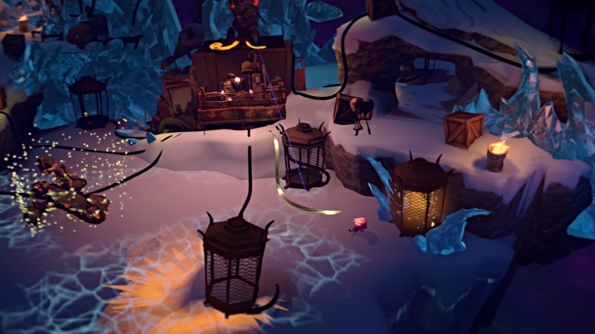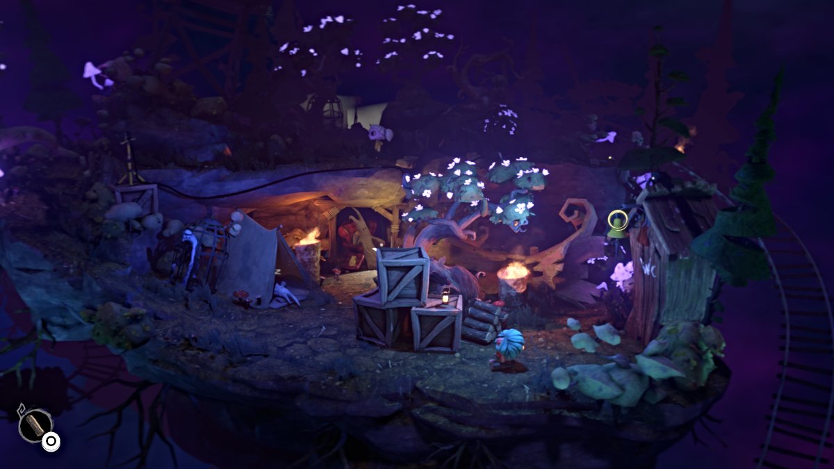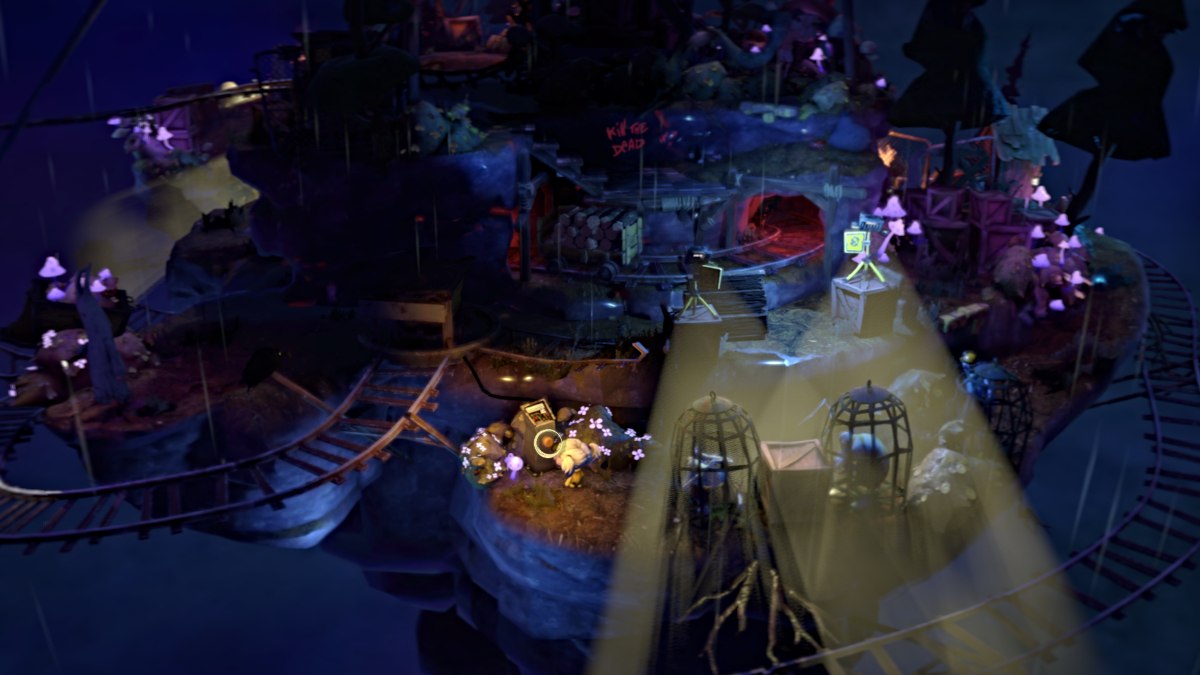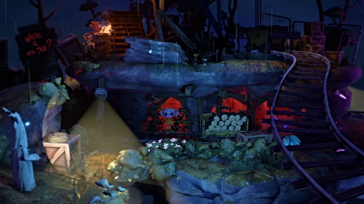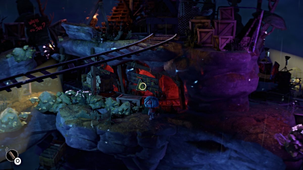 По прибытии нажмите кнопку на правой стороне, чтобы активировать мост, как показано на изображении. Затем переключитесь на игру за Угрюмого и переместите его, чтобы полностью перетащить мост через рельсы.