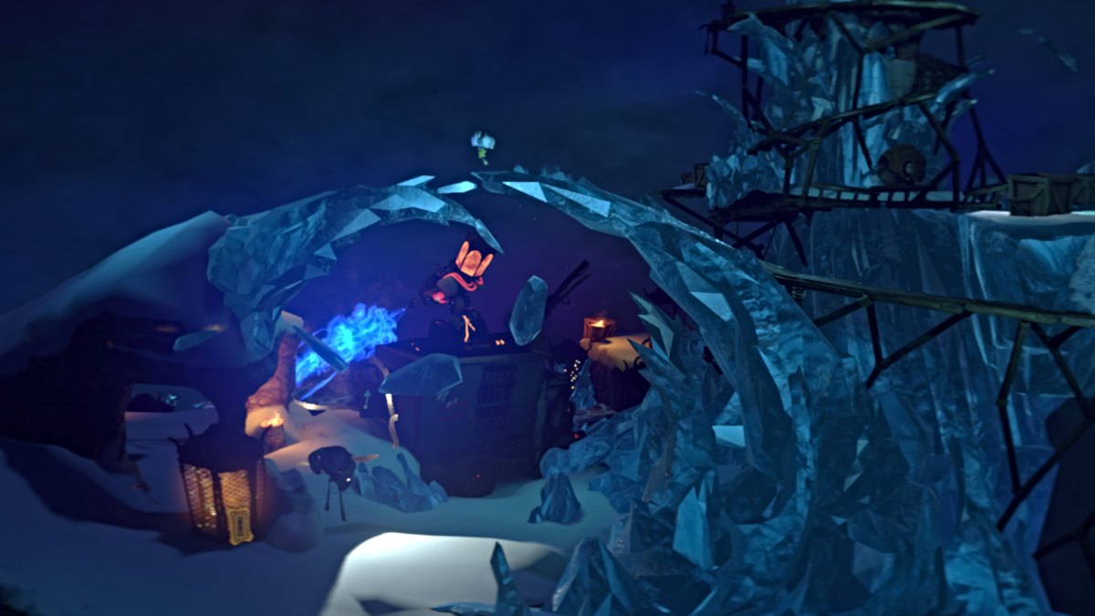 Поверните налево и следуйте по тропинке, пока не увидите стену, по которой можно спуститься. Спустившись, пробегите по деревянному настилу на лед. Перепрыгните через пропасть на другую сторону, затем спуститесь по склону.