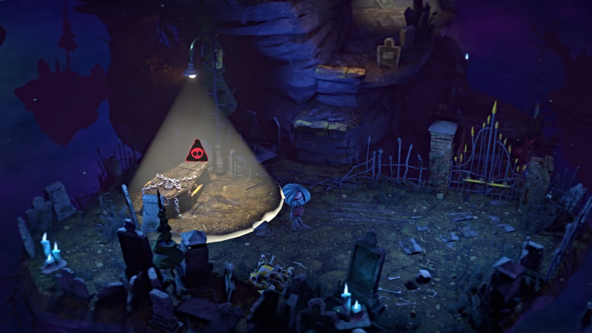 Вернитесь к гробу и, когда увидите сигнал, быстро бросьте кость в фонарный столб. Это выключит свет, позволяя вам приблизиться к гробу. Не задерживайтесь, так как свет не будет выключен надолго.