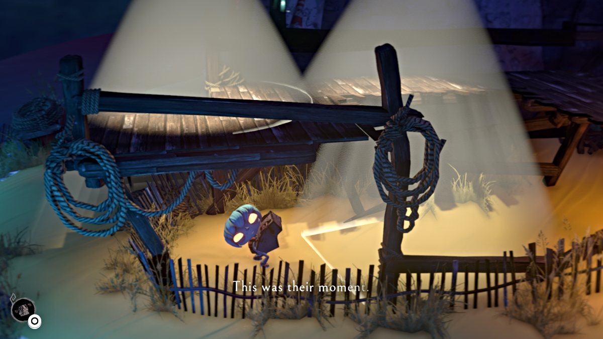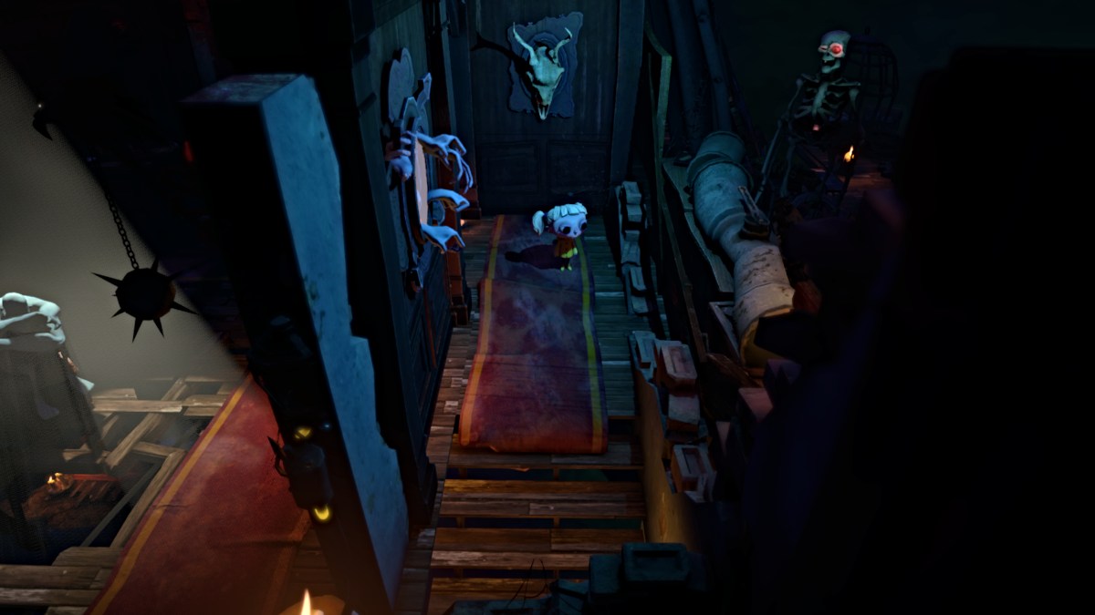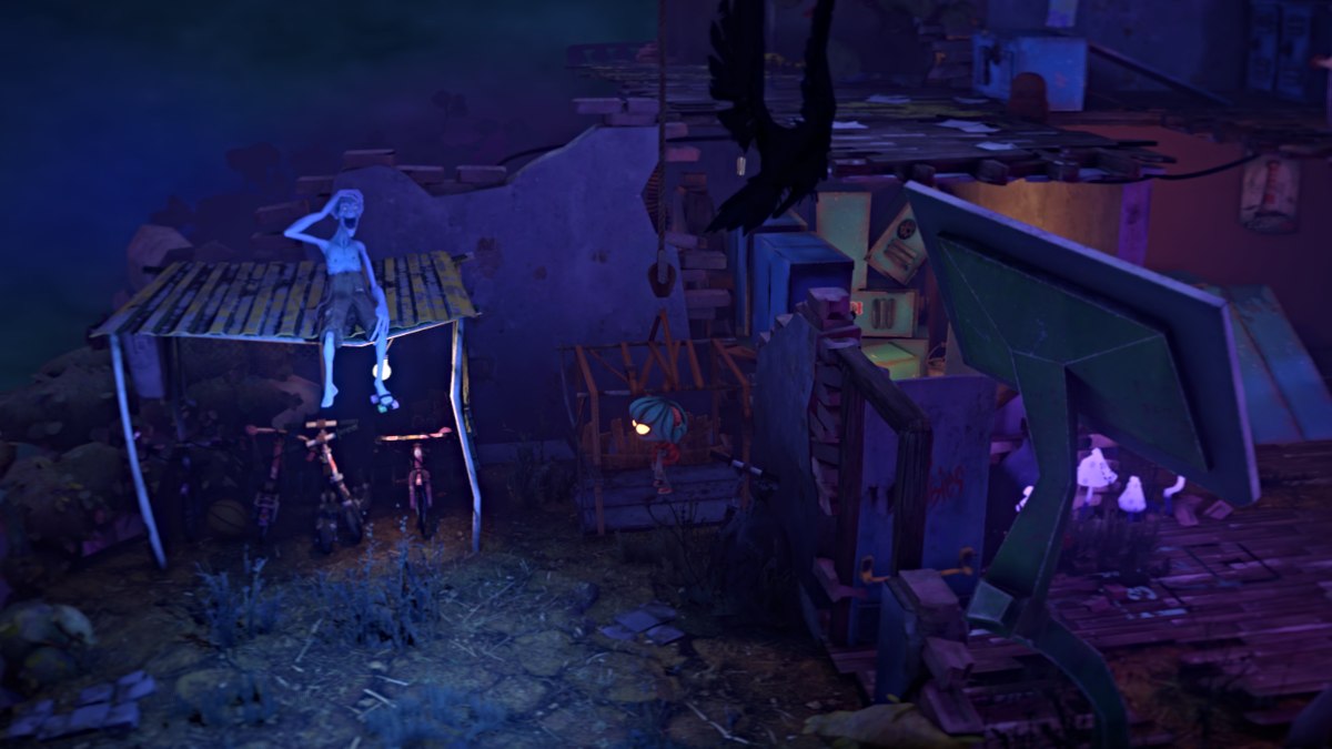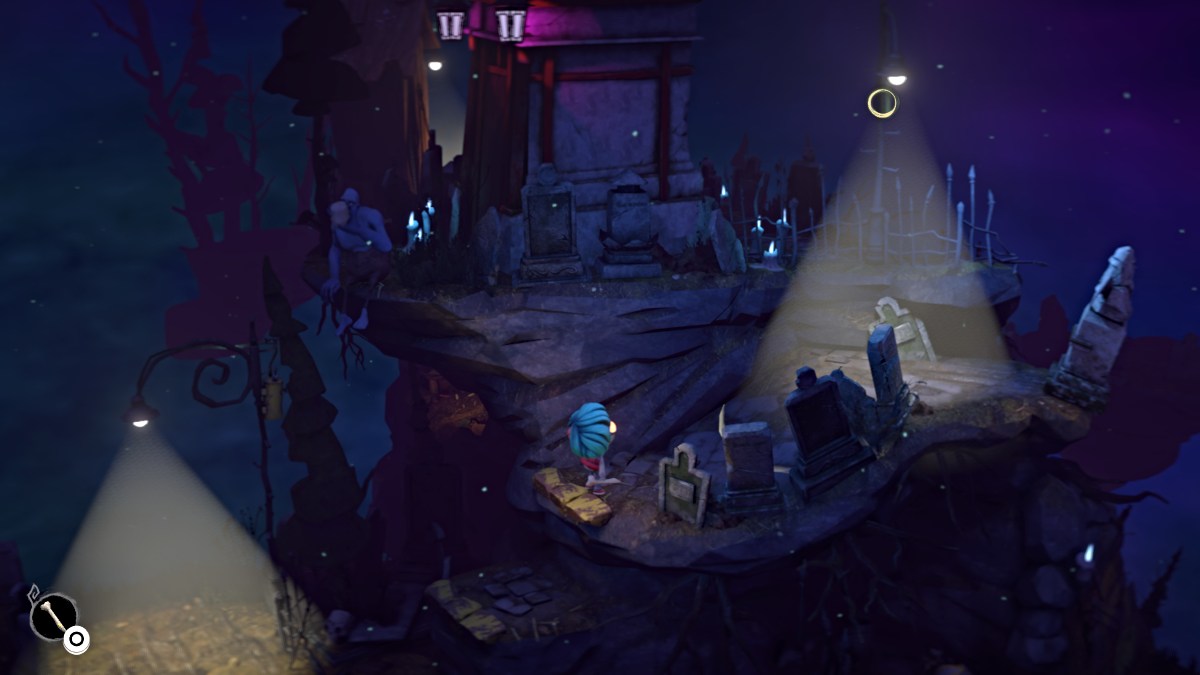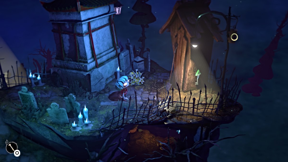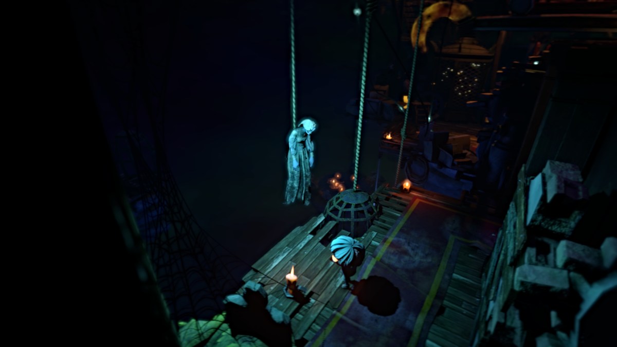Давайте сделаем паузу. Вернитесь и возьмите еще одну кость из кучи, затем взберитесь на желдую полку. Вы увидите еще один фонарный столб впереди — бросьте кость в него, чтобы раскачать фонарь на другую сторону забора.