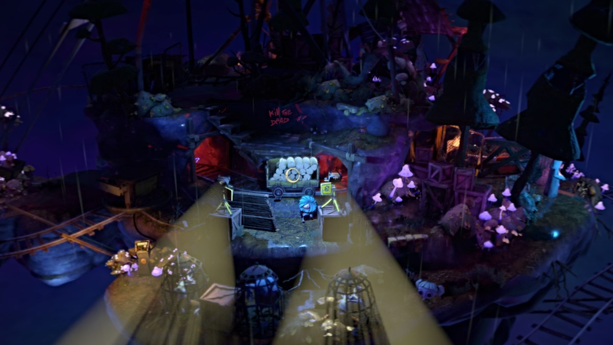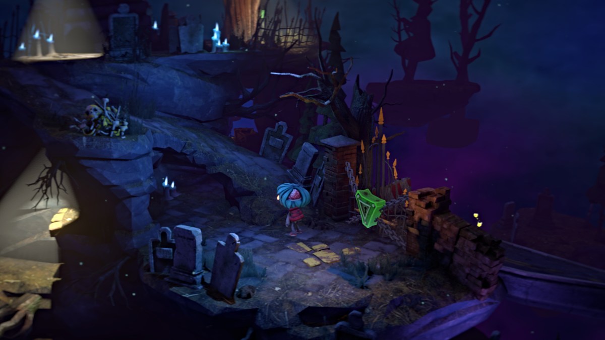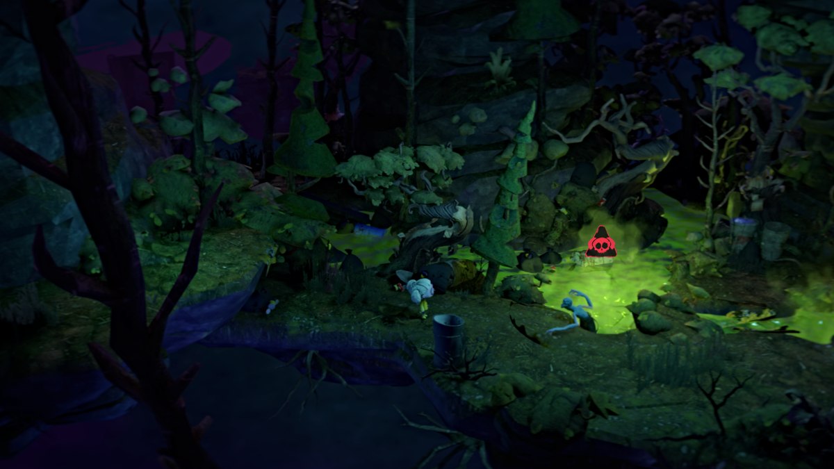 Окей, значит, мне нужно нажать на кнопку на панели управления — это выключит свет на некоторое время и позволит Мрачному пройти. Теперь я переключаюсь на Мрачного и бегу к тому месту, где этот зомби прячется в разбитой чашке — ты знаешь, туда же, где я брал Синий Ключ раньше.