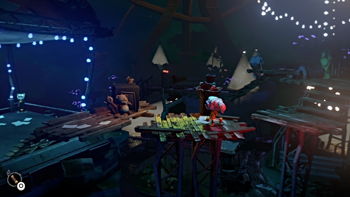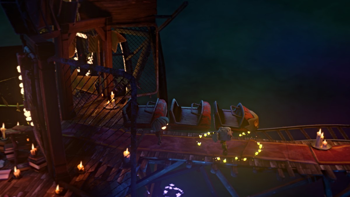 Перейдите к Мрачному и быстро возьмите баллон, затем найдите безопасное место обратно на карусели. После этого переключитесь на игру за Нену и пробегите по карусели к тому месту, где находится Мрачный.