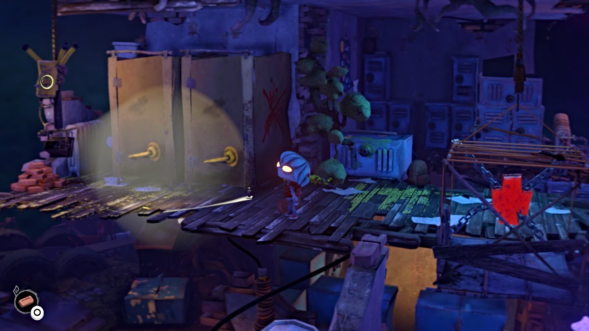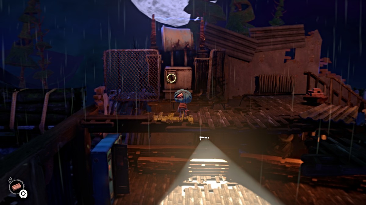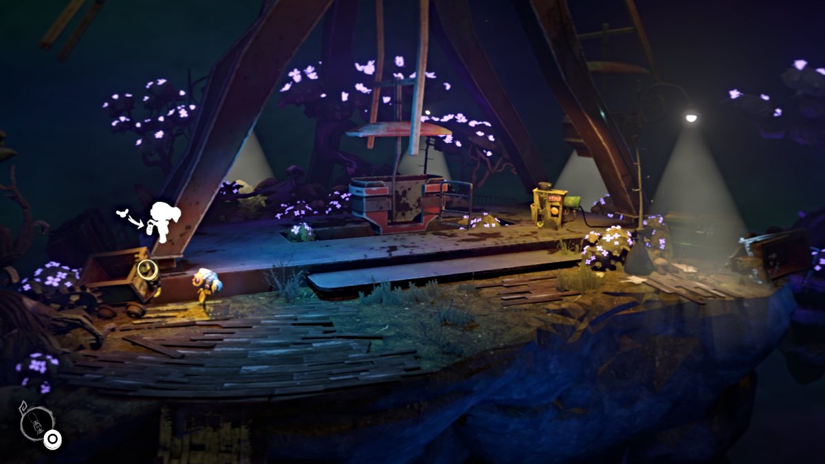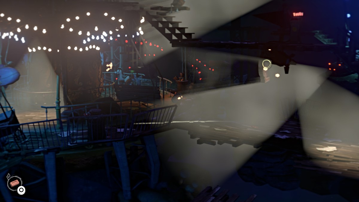 Возьмите кирпич из кучи неподалеку, затем снова запрыгните на карусель и продолжайте двигаться налево. Вскоре вы достигнете тропы, заблокированной прожекторами. Бросьте кирпич в первый прожектор, чтобы сдвинуть его.