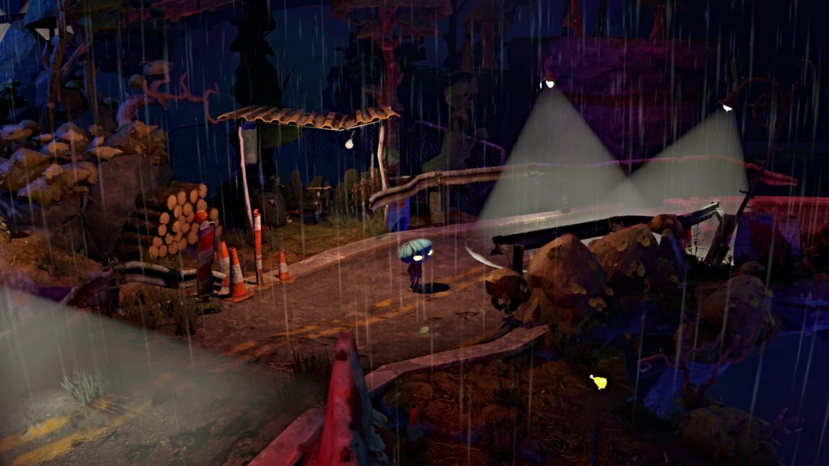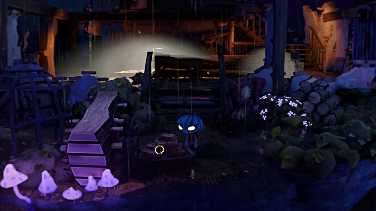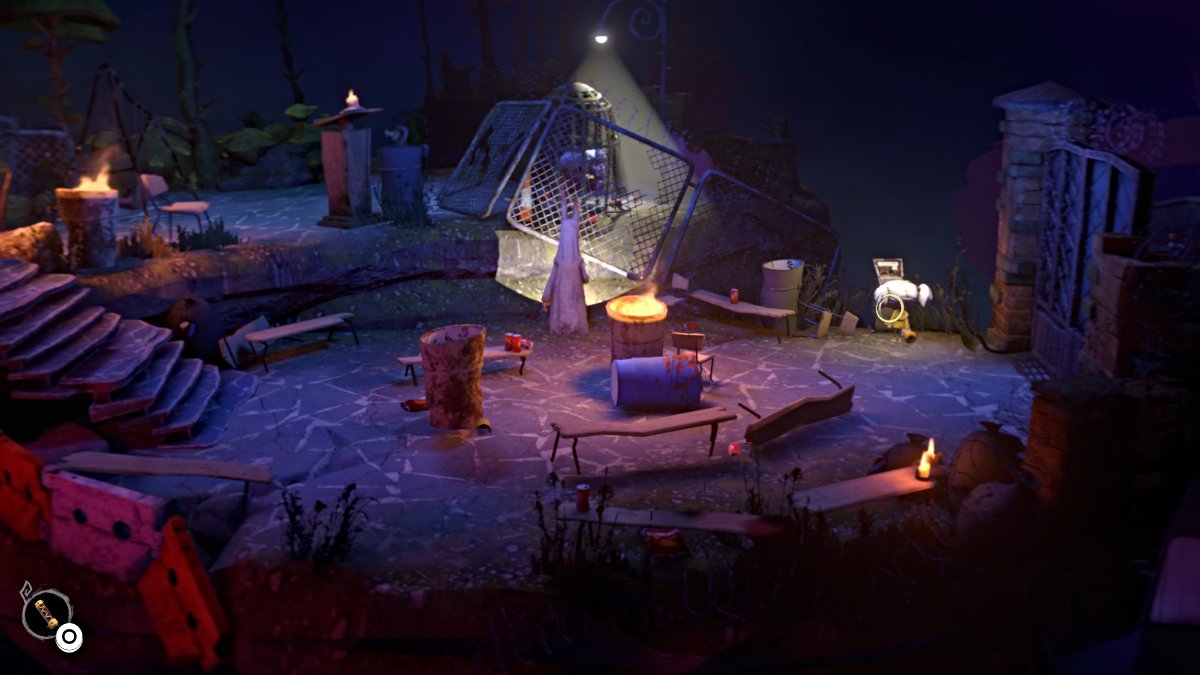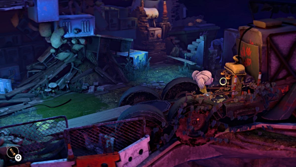 Возьмите кирпич из кучи неподалеку, затем снова запрыгните на карусель и продолжайте двигаться налево. Вскоре вы достигнете тропы, заблокированной прожекторами. Бросьте кирпич в первый прожектор, чтобы сдвинуть его.