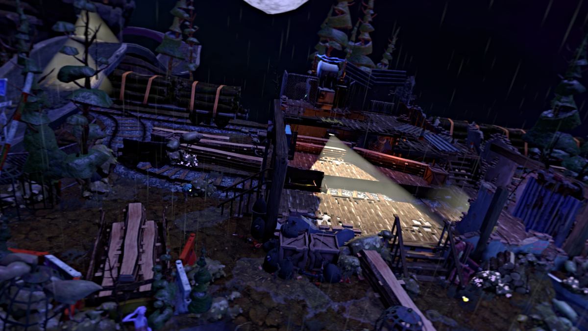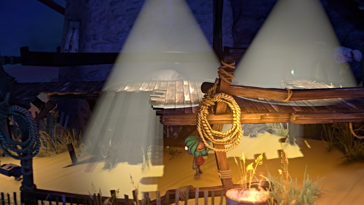 Чтобы решить эту задачу, спуститесь по наружной лестнице и возьмите кирпич из стопки, которую вы там увидите. Пройдите по тропинке, пока не заметите жёлтую метку, указывающую место, где заблокирован свет. Бросьте кирпич в это место, а затем вернитесь внутрь.