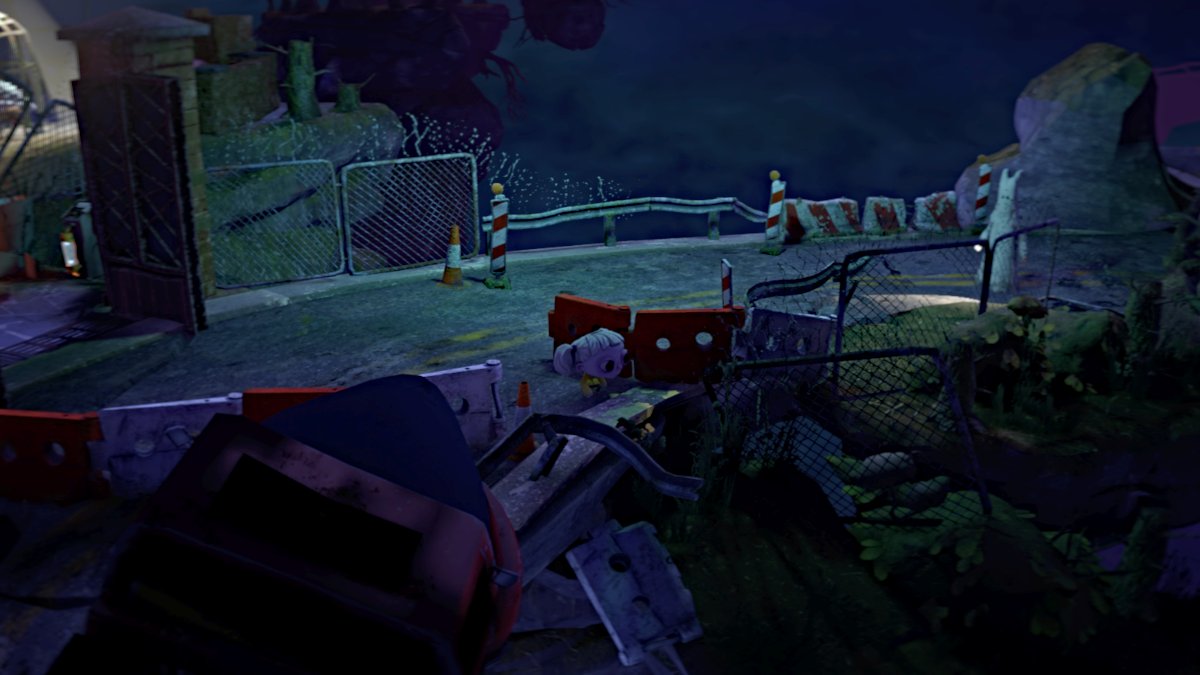 Постарайся покинуть территорию до того, как до тебя доберётся то, что приближается. Опусти рекламный щит, используя жёлтую рукоятку спереди, чтобы создать мост. Перейди по мосту, а затем спрыгни на нижнюю дорогу.
