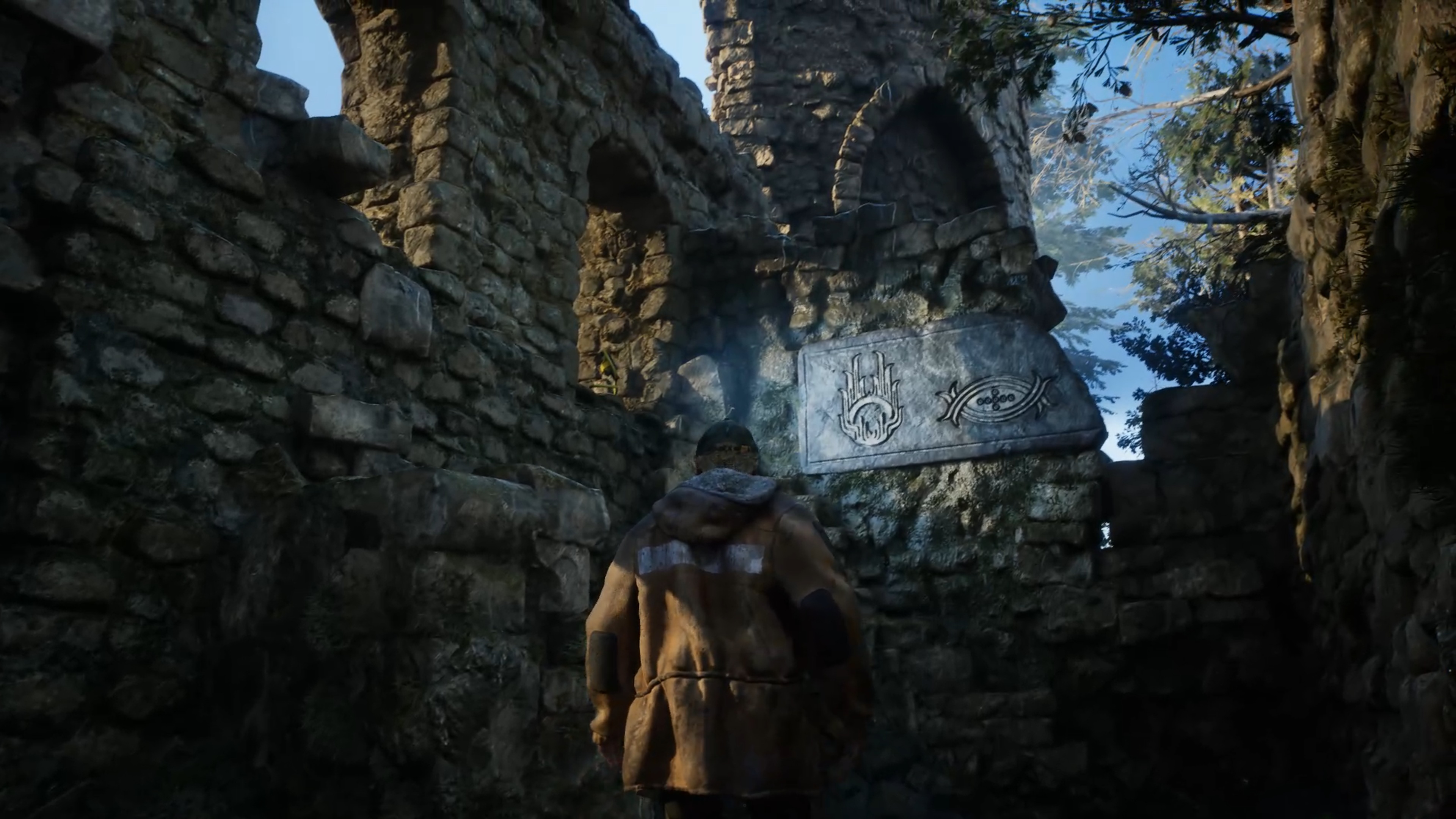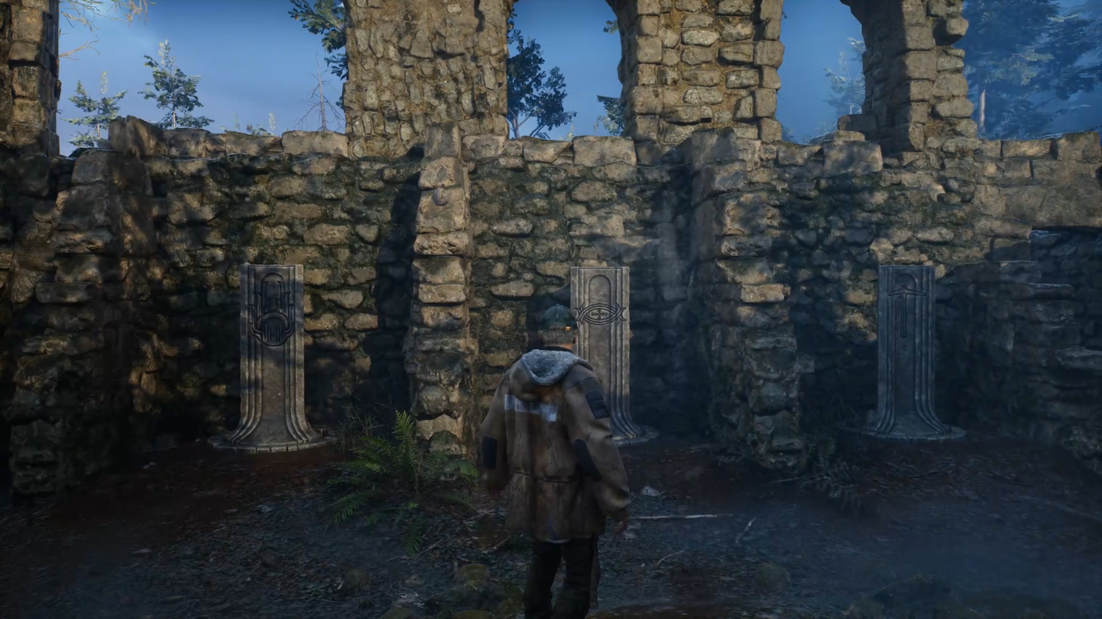 Следуя за солдатом к весам рядом с ним, я замечаю выгравированный камень с постаментом и еще двумя гравировками позади него. Взаимодействуя с постаментом, я обнаруживаю старый механизм, который при использовании высвобождает колонны. Используя надписи с изображением огня, глаза и кирки, я запускаю событие. (Перспектива от первого лица геймера)