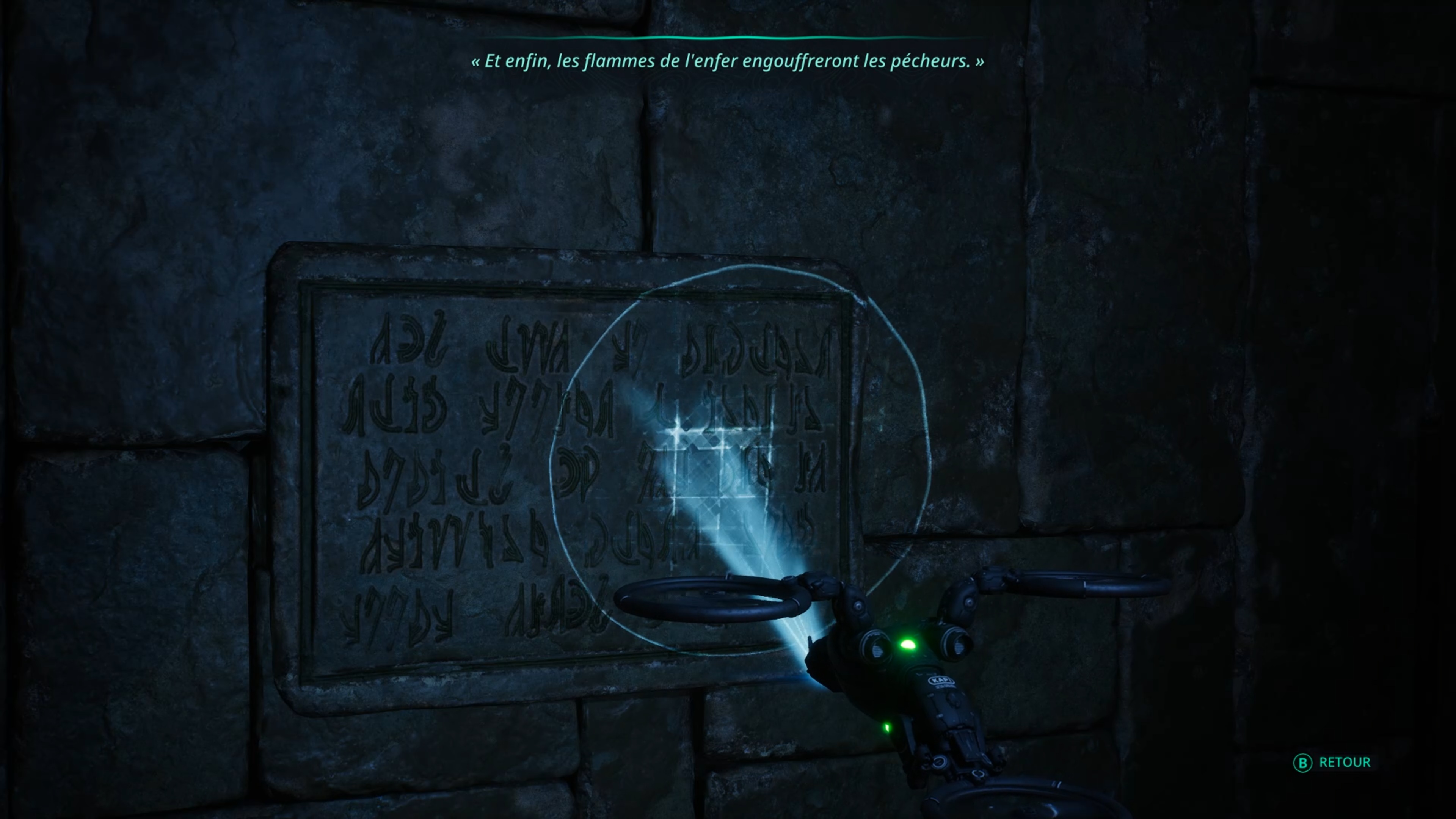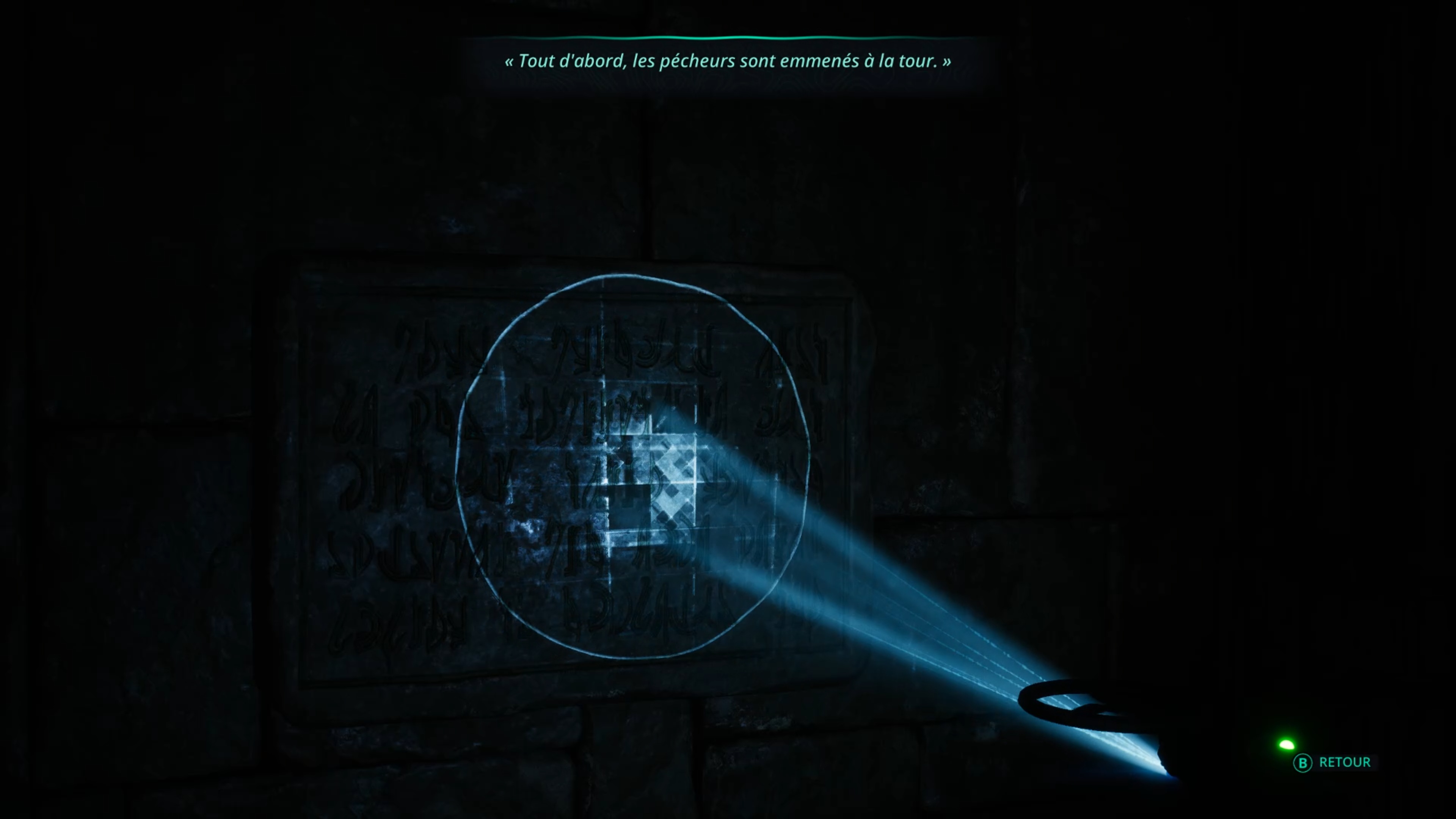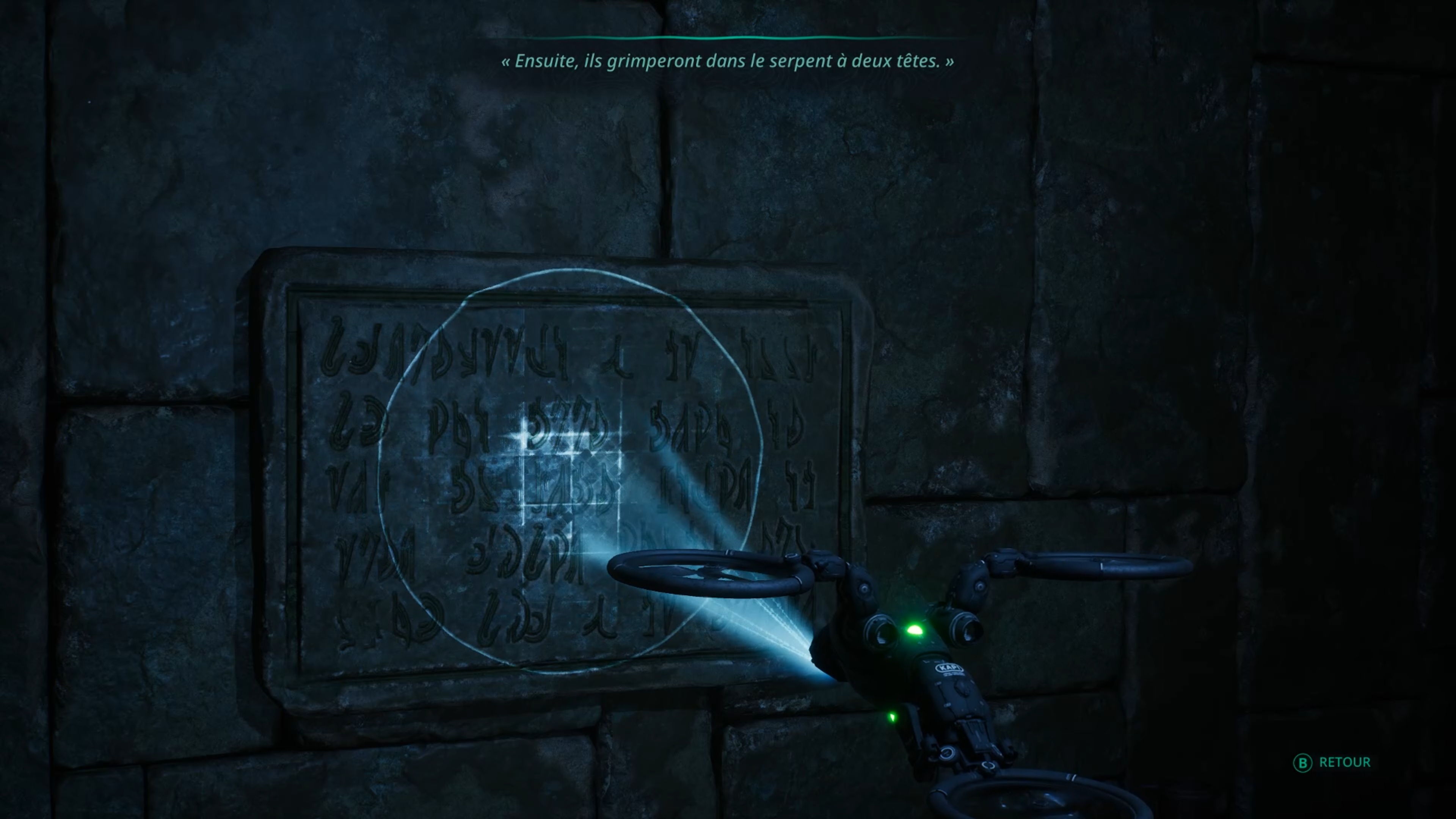 Чтобы разгадать тайну, направляйтесь на восток по коридору, где вы найдете надпись о башне рыбака. Пройдите через дверь, чтобы найти вторую надпись о двухголовой змее, за которой последует еще одна, намекающая на пламя. Если внимательно прочитать надписи, вы получите код. Подойдите к солнечным часам и сначала поместите башню рыбака, затем двухголовую змею, и, наконец, пламя.