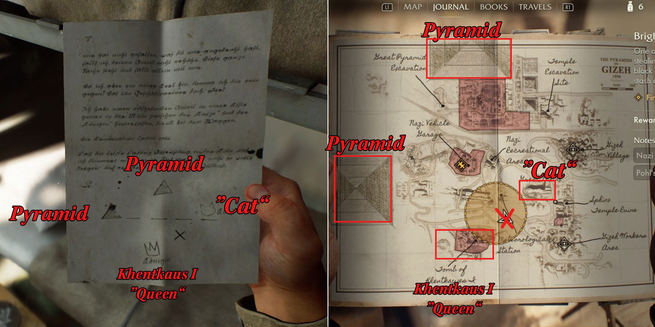 Сундук находится где-то между Большим Сфинксом (кот) и гробницей Хенткаус I (королева). На рисунке также показана одна пирамида, расположенная к северу от X (место ящика), и одна, расположенная к западу, что можно увидеть на карте, поскольку на карте только две великие пирамиды.