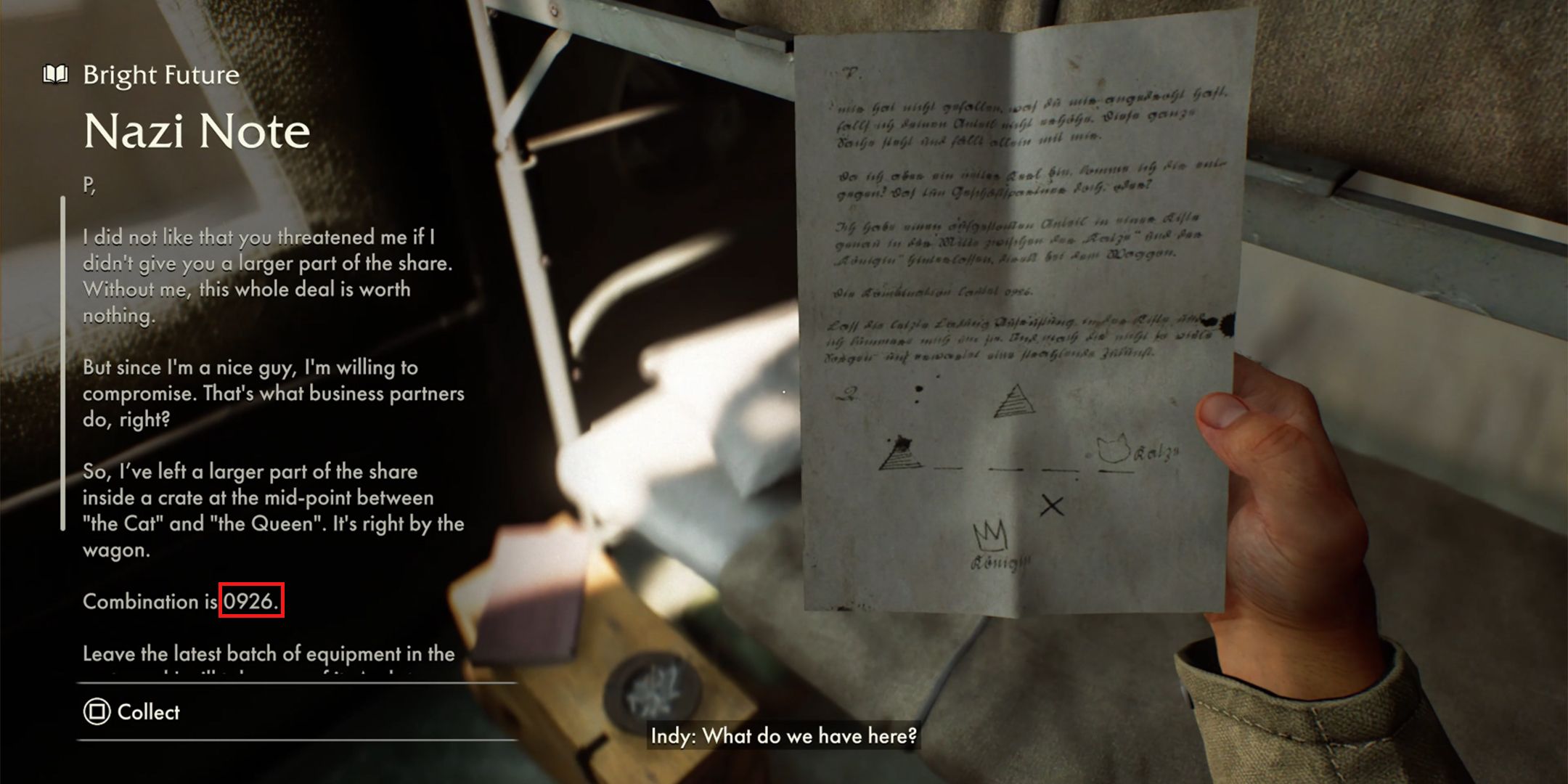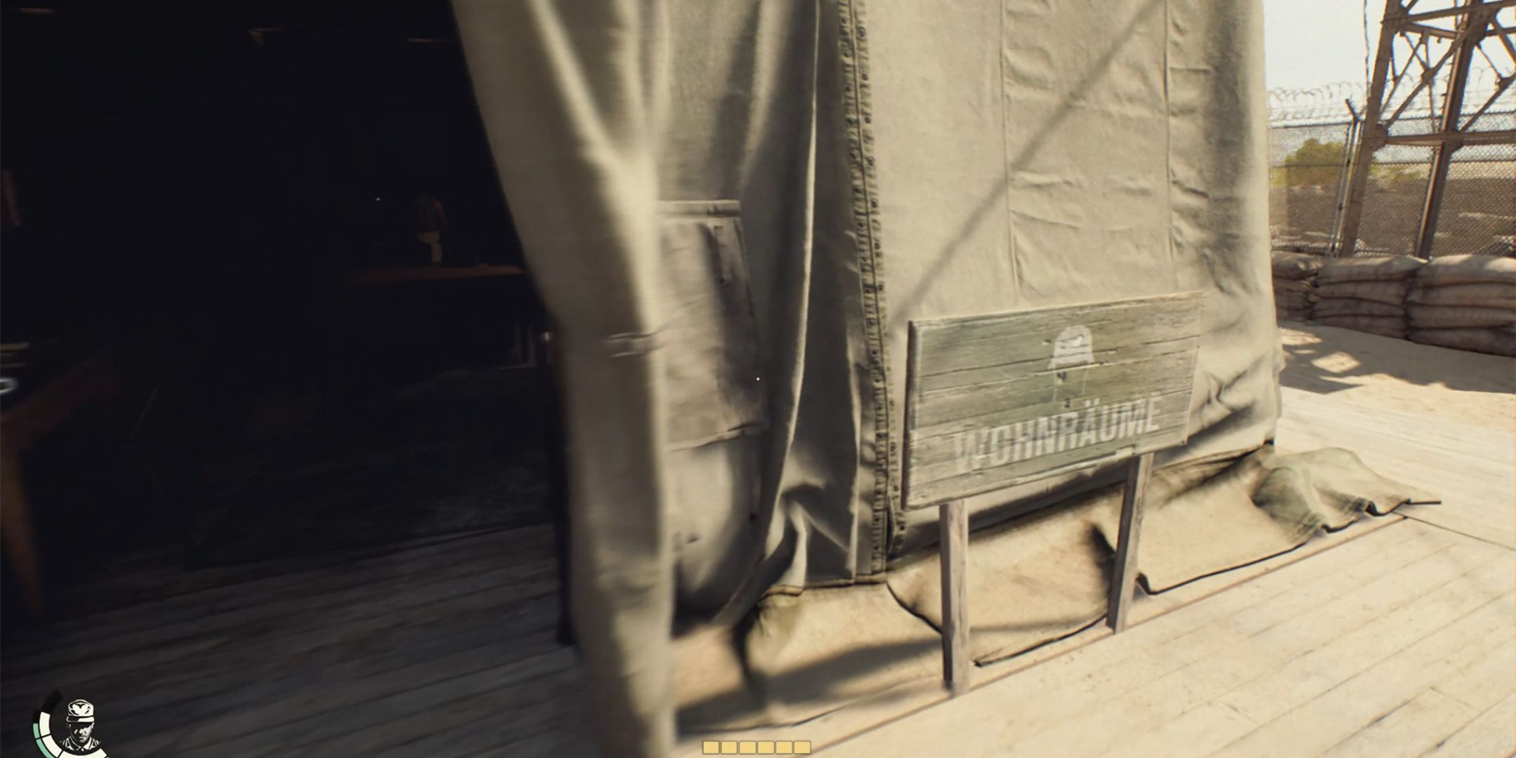 Подойдите к палатке, рядом с которой находится зеленая табличка с надписью «Wohnräumē». Идите к двухъярусной кровати с левой стороны, где вы найдете желтую шляпу. Прочитайте загадочную записку рядом с ней. Нацистская записка содержит безопасную комбинацию и местоположение сундука. Там говорится, что сундук находится на полпути между «кошкой» и «королевой».
