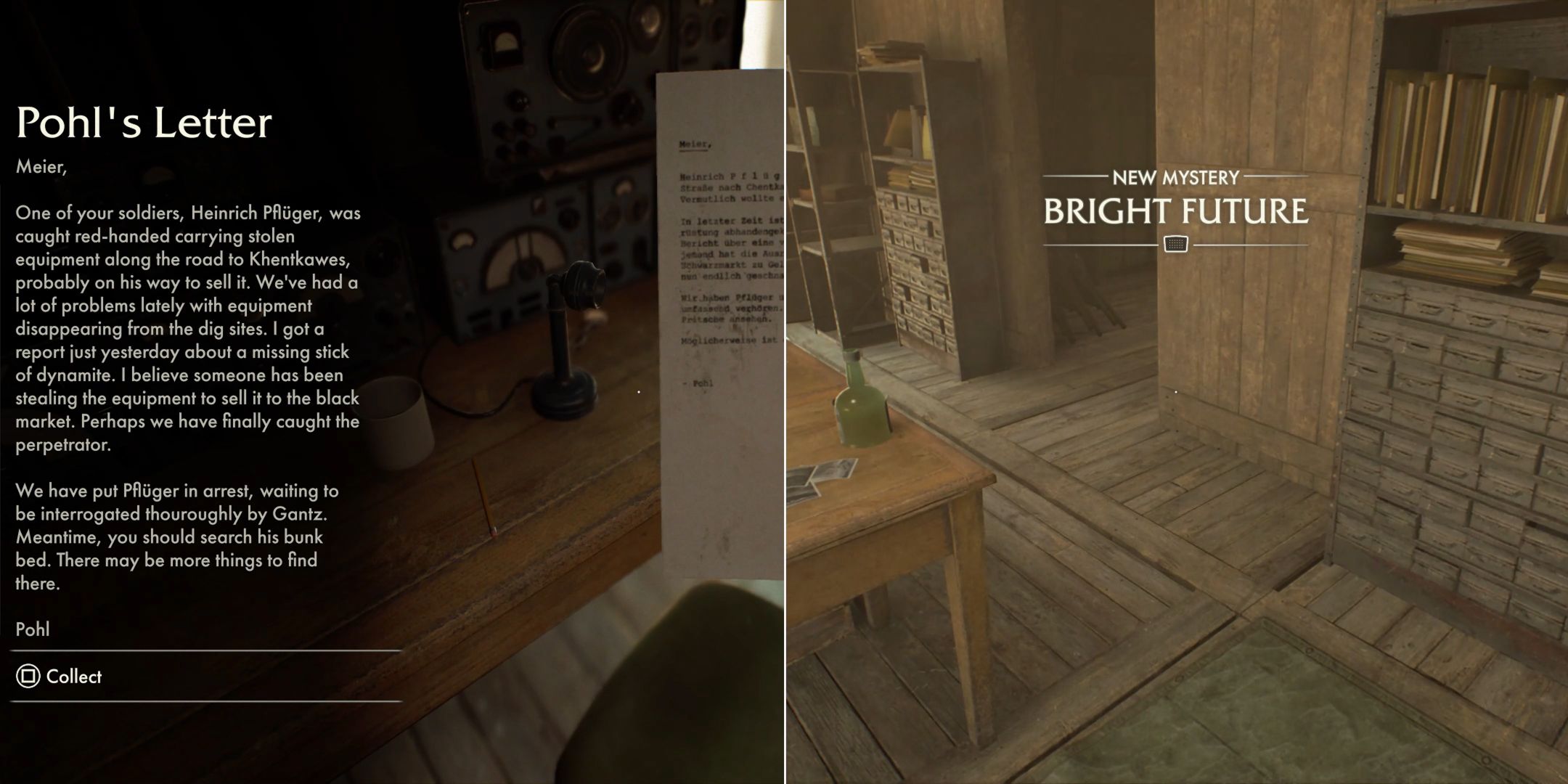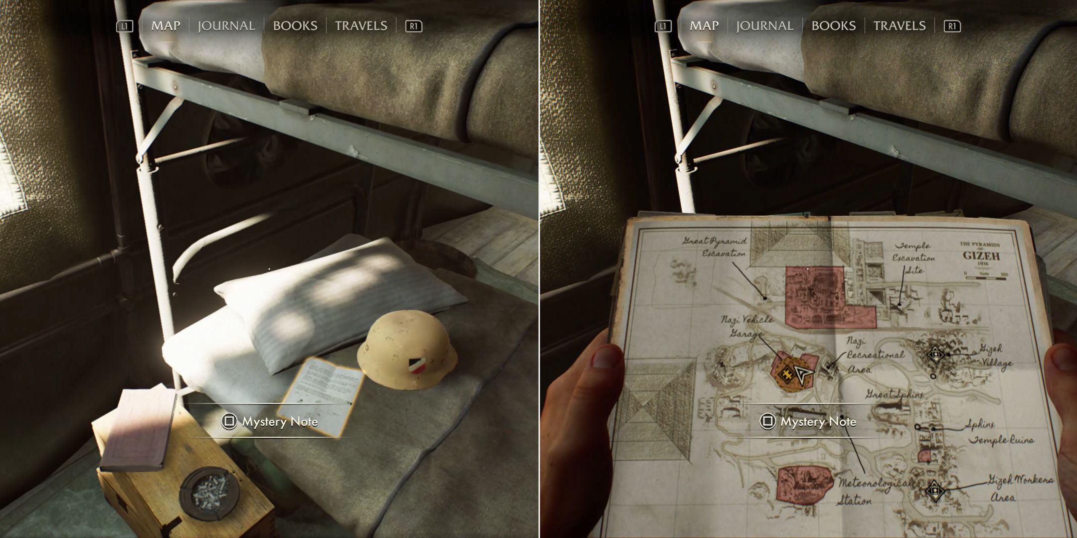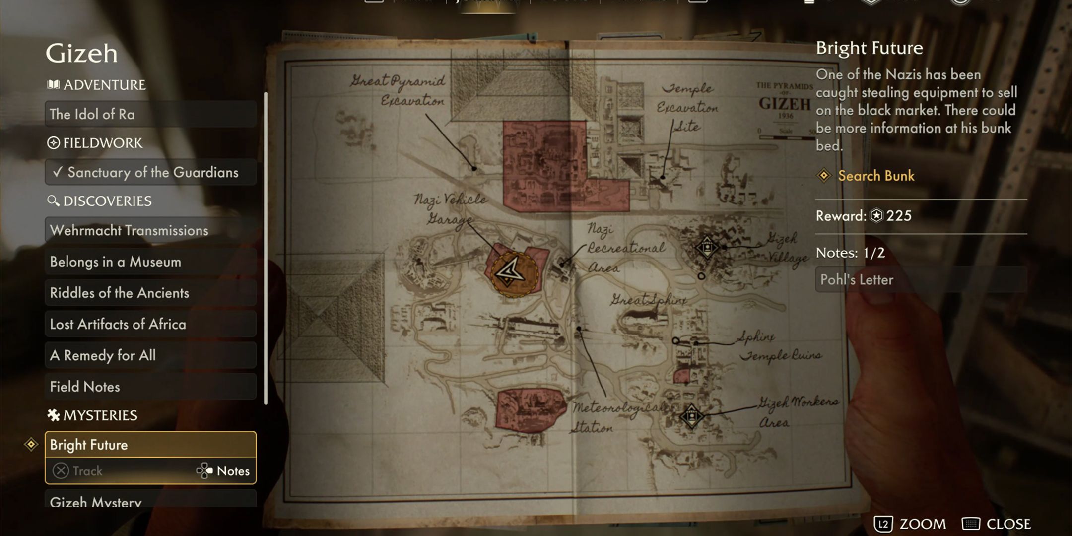 Сначала отправляйтесь в сектор «Нацистский гараж» в Гизе. Помните, что эта зона закрыта, поэтому наденьте форму Вермахта из «Индианы Джонса и большого круга», чтобы избежать нежелательного внимания. Затем найдите палатку, оборудованную радио, и возьмите «Письмо Пола». Это действие запускает Тайну Светлого Будущего. В письме намекается, что один из солдат был пойман на краже оборудования. Чтобы узнать больше подробностей, обыщите двухъярусную кровать, отведенную этому солдату.