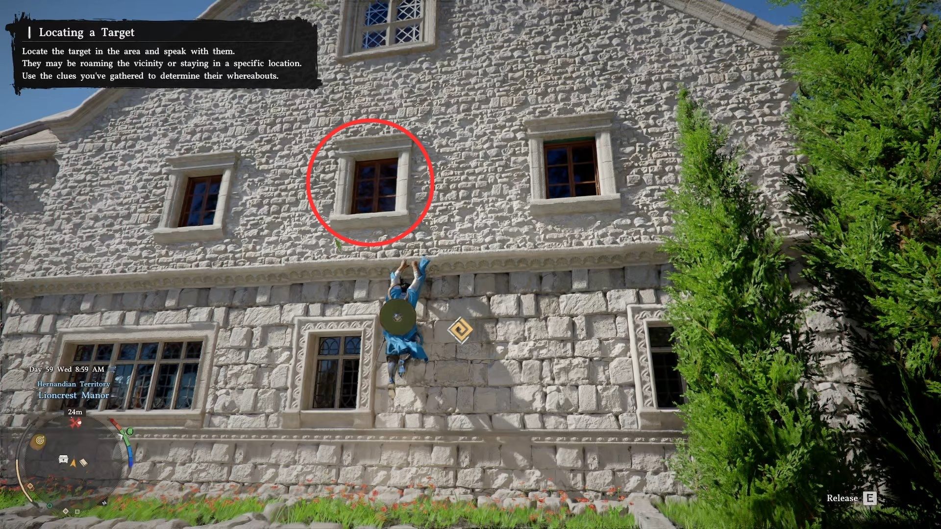 Climb up to the window in the middle, open it, and enter the manor.