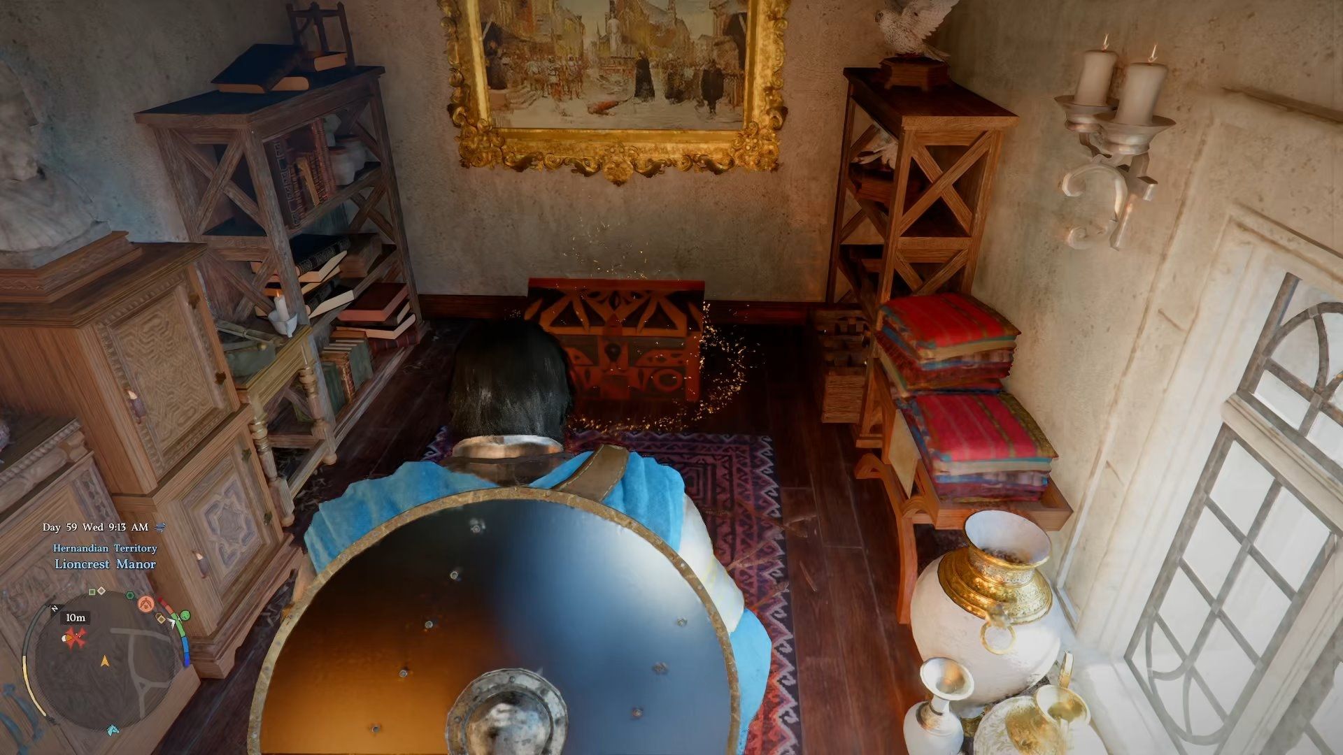 Большой щит Рхонида в Crimson Desert – красивый щит, сделанный из чистого золота и украшенный рубинами. Вы можете найти его внутри запертого сундука с сокровищами на верхнем этаже поместья Лайонкрест. Это поместье находится к северо-западу от города Эрнан – ищите его прямо под буквой ‘D’ на игровой карте.