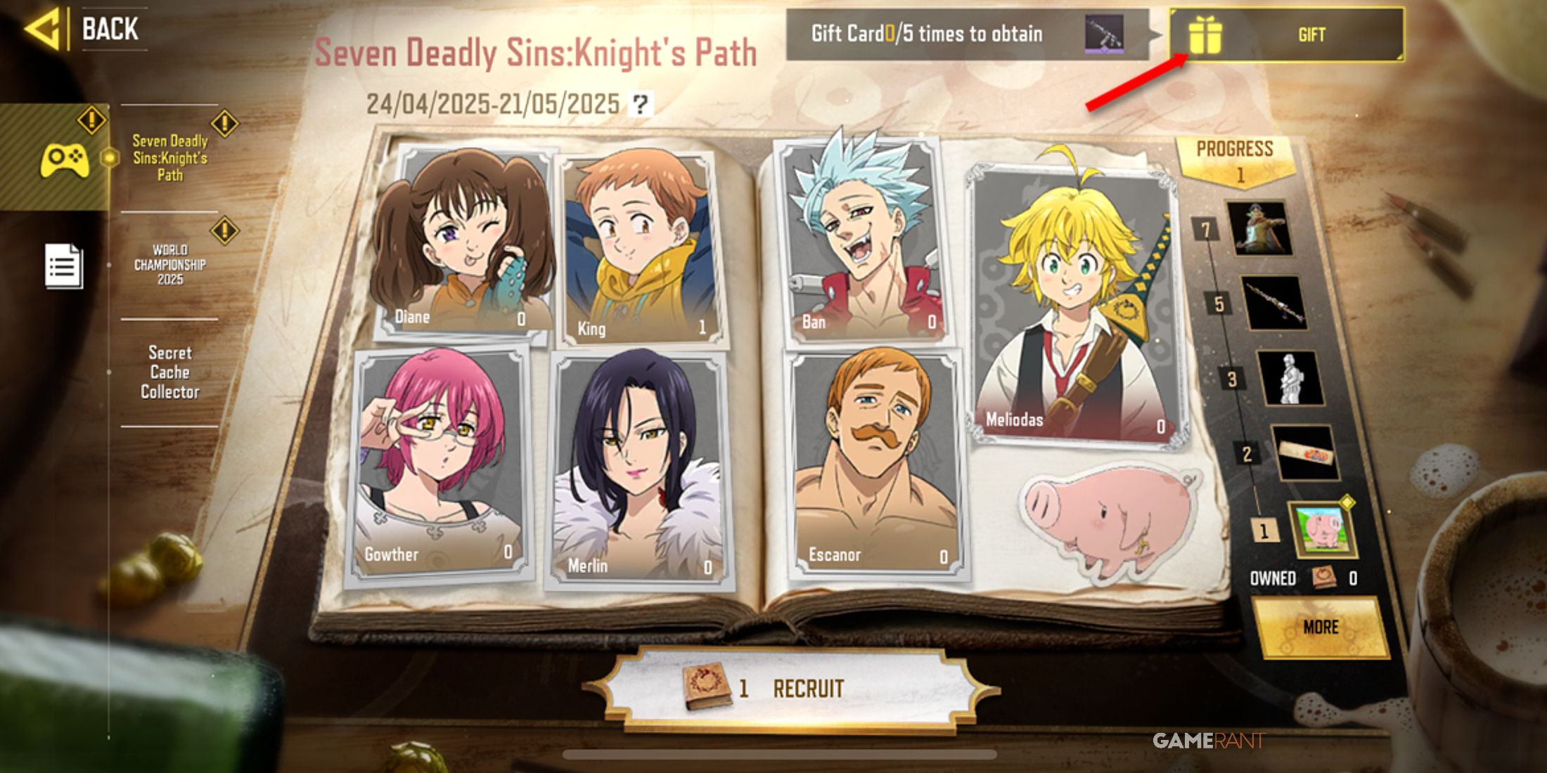 Пользователи могут получить доступ к своим заданиям, нажав на опцию ‘Подробнее’ внутри интерфейса события, и эта группа задач обновляется ежедневно в полночь по UTC (Всемирному координированному времени). После выполнения заданий игроки могут использовать полученные Оат Шарды для перехода в раздел ‘Рекрутировать’, чтобы вытащить случайную Карту персонажа, таким образом присоединяя одного из Семи смертных грехов и запуская награды за достижение целей. Чтобы получить все награды, игрокам необходимо завербовать всех семь членов команды.