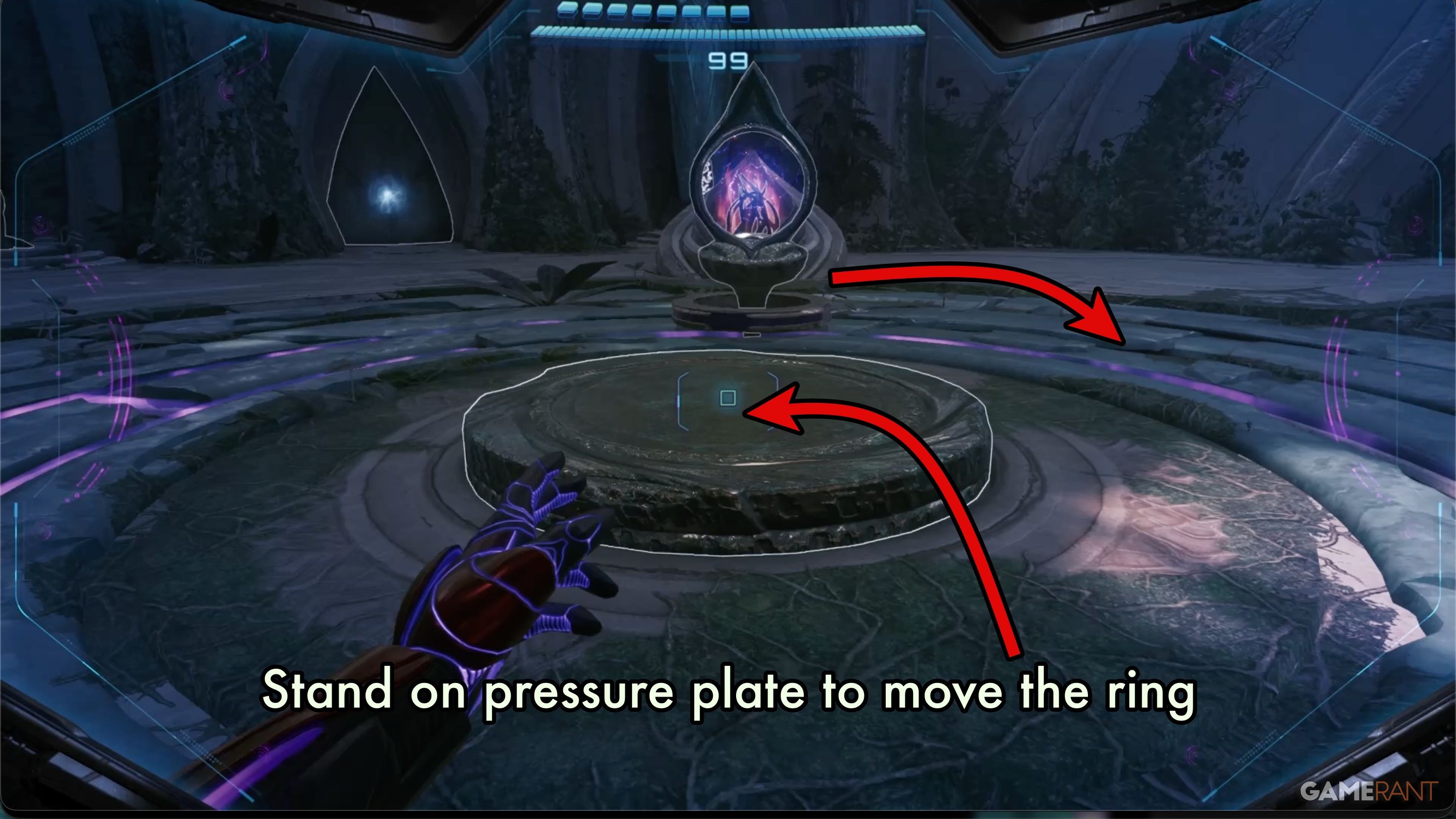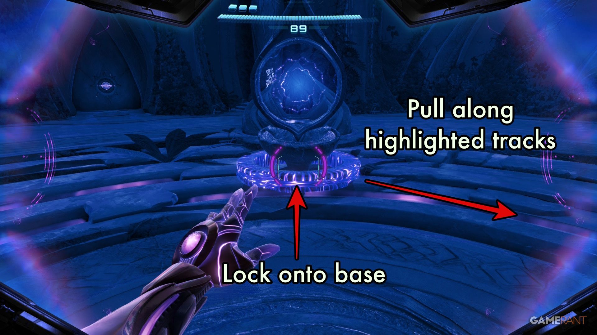 Чтобы начать головоломку, найдите и встаньте на нажимную пластину в центре большой круглой области. Как только вы встанете на неё, вы сможете ухватиться за кольцо и скользить им по треку. Ваша цель — расположить кольцо напротив каждой из трёх заострённых фигур вокруг трека. Когда кольцо будет правильно установлено, каждая фигура откроется, обнажив под собой жаровню.