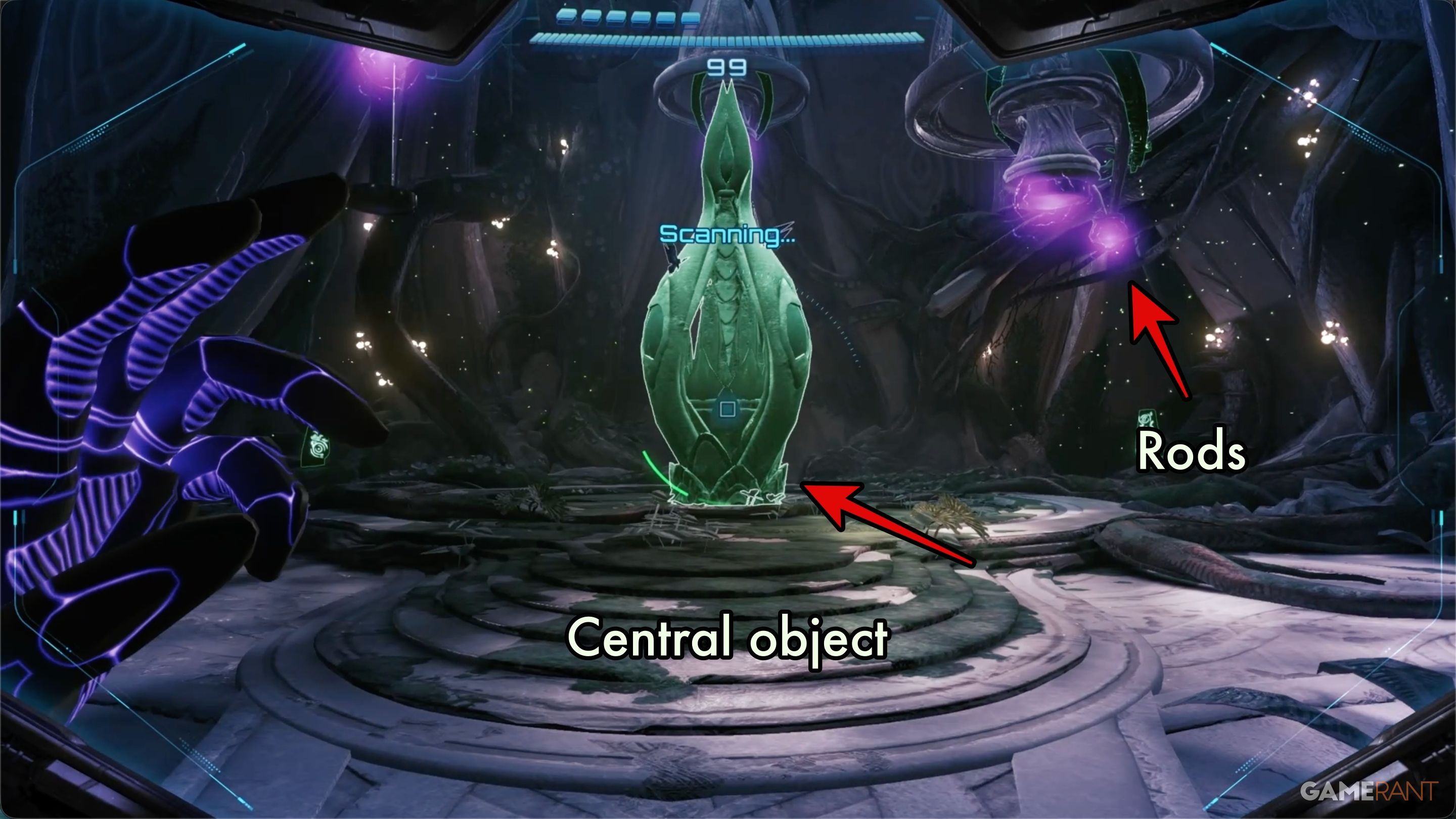 Из главной комнаты поверните направо и уберите устройство, блокирующее дверь. Внутри вы найдете странную структуру в центре с тремя стержнями. Вы можете использовать свои психические способности, чтобы повернуть эти стержни. У каждого стержня есть две движущиеся части: одна, чтобы направить его на центр структуры, и другая, чтобы опустить стержень вниз.