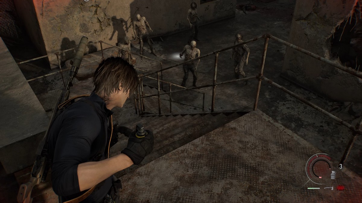 Идите прямо и сражайтесь с зомби, пока поднимаетесь на второй этаж. Продолжайте следовать по пути, пока не начнёте слышать большую группу зомби – большинство из них на третьем этаже, поэтому продолжайте быстро подниматься по лестнице. Прорвитесь сквозь толпу возле небольшого моста и не стесняйтесь использовать гранату, если на вас нападают одновременно около 5 или 6 зомби.
