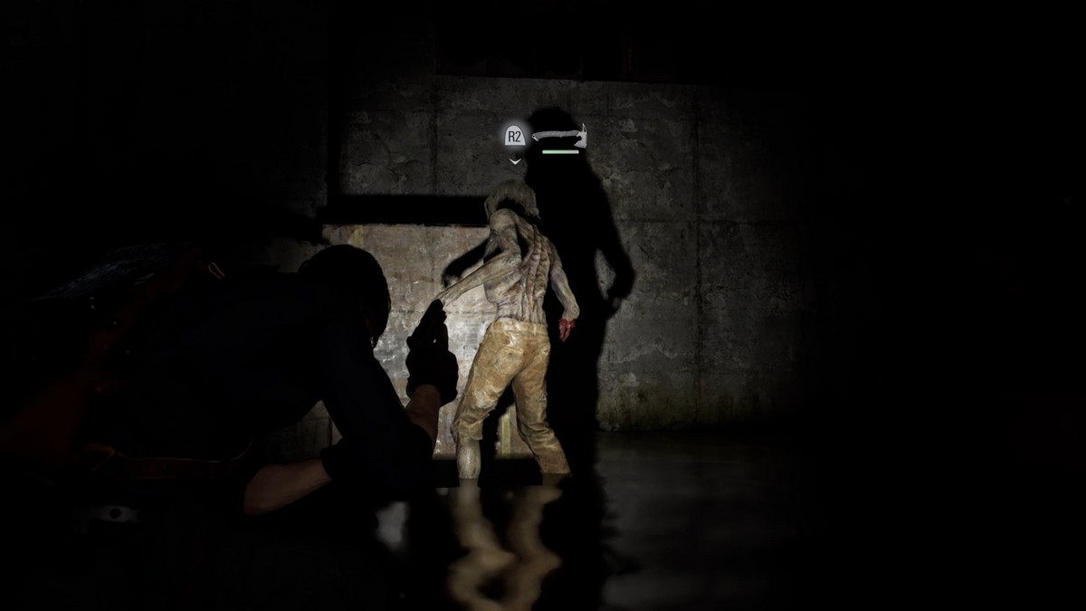 Вернитесь к лестнице и поднимитесь. Откройте дверь справа, но подождите, прежде чем войти. Продолжайте прямо, и не пытайтесь подкрасться и убить зомби.