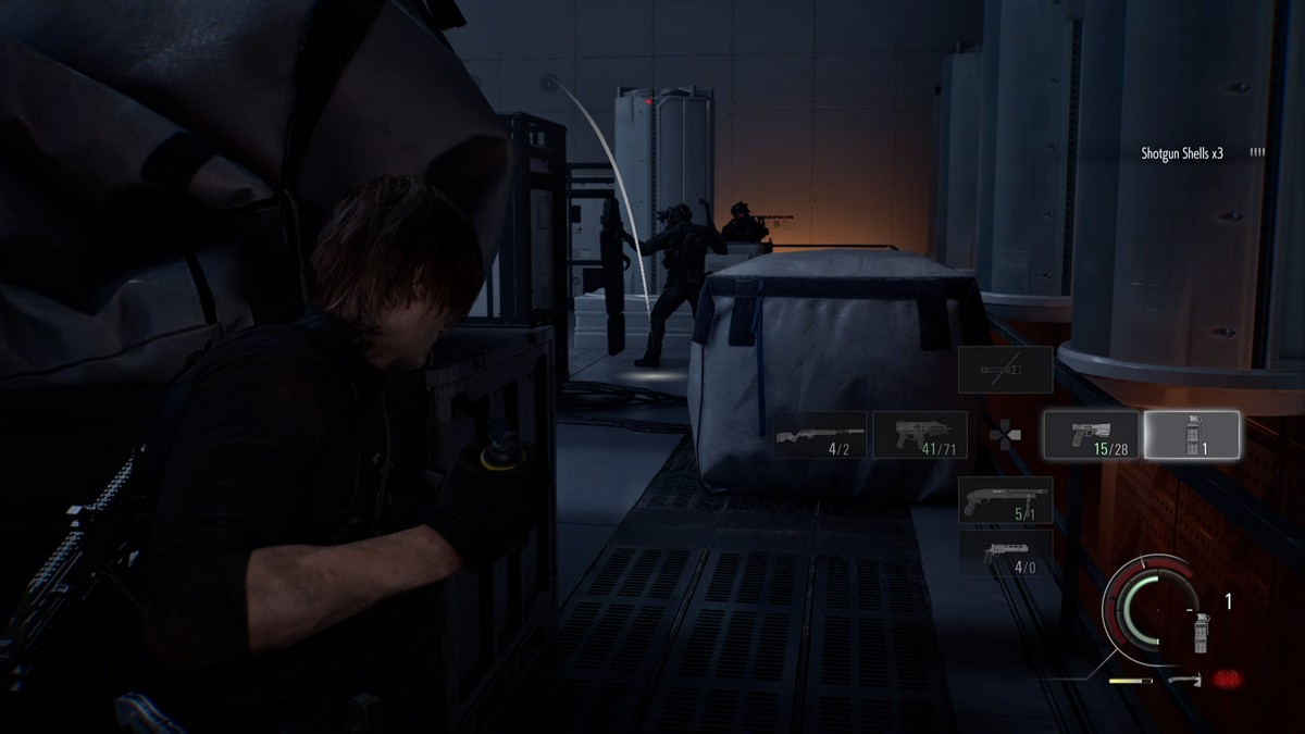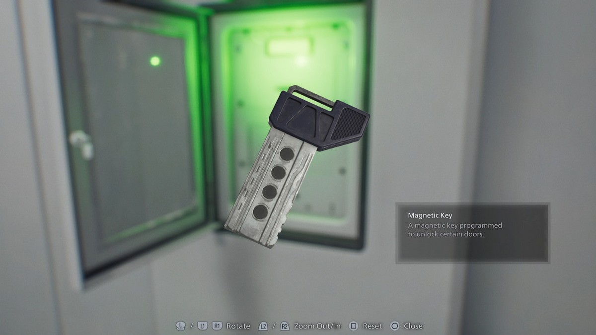 Отправляйтесь в Лабораторию и сохраните свой прогресс. Затем вернитесь и спуститесь по лестнице. Будьте осторожны – здесь начнёт бродить Ликер, поэтому ползите медленно. Используйте Ключ Обхода на панели управления, чтобы открыть путь для Леона. Прежде чем уйти, повернитесь и возьмите Магнитный Ключ из коробки на стене.