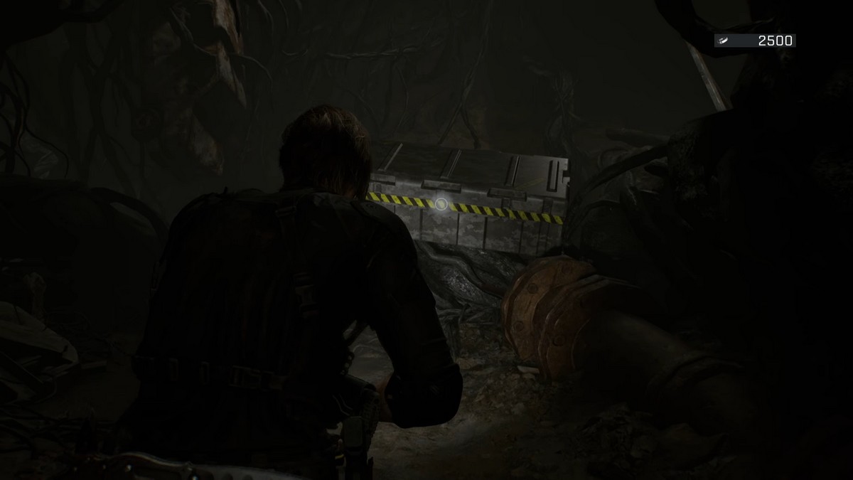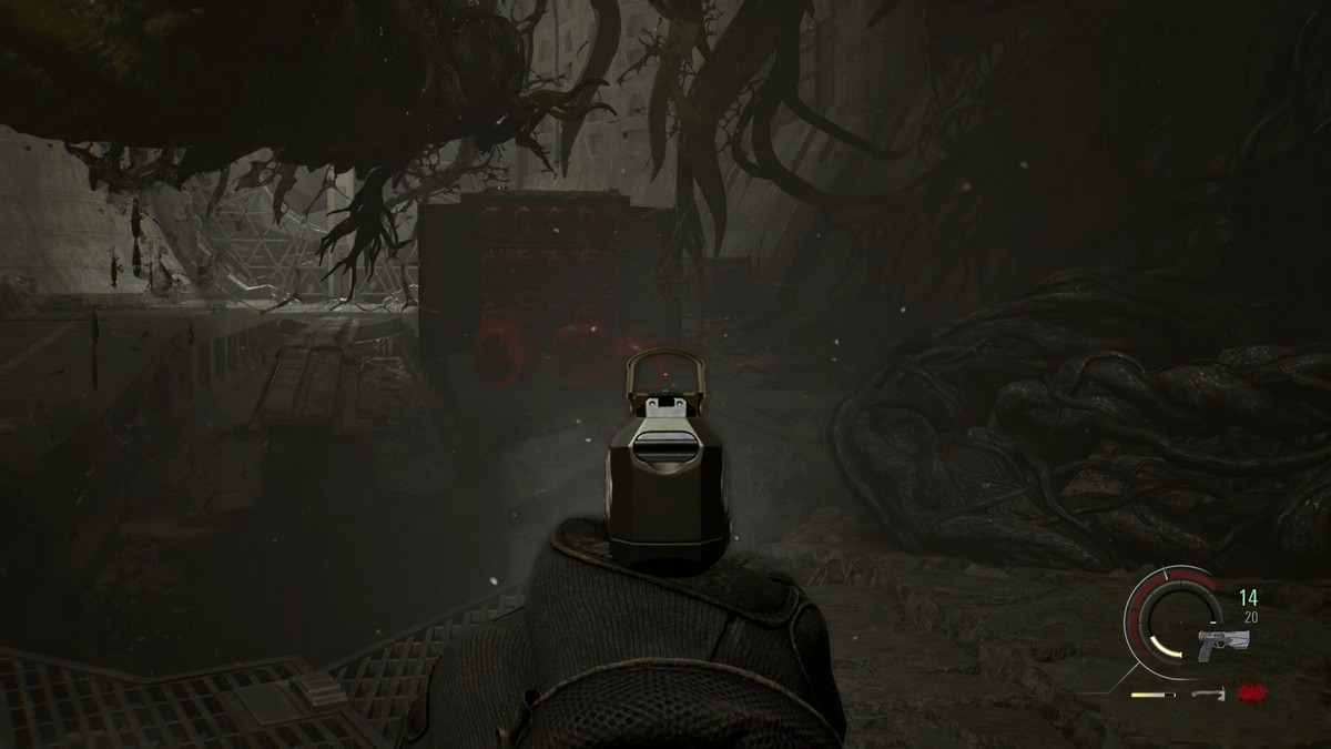 Продолжайте движение вперед, но будьте осторожны! Если вы увидите темный щупальце на земле, проходя через него, вы разбудите растение. На середине пути есть небольшой обход – выберите левый маршрут. Следуя по этой тропе, вы доберетесь до контейнера с полезными припасами, включая патроны 12.7x55mm.
