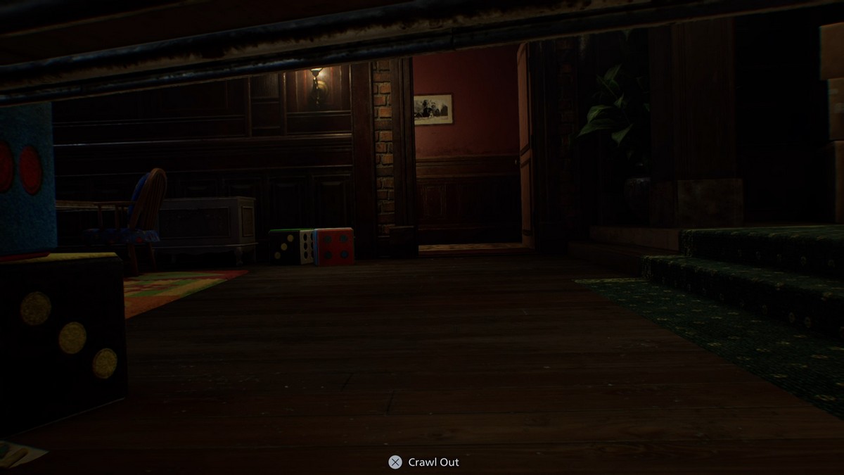 Обратите внимание на столы по бокам – вы можете использовать их, чтобы спрятаться. Вернитесь наверх по лестнице, и вы снова начнете слышать звуки. Быстро спуститесь вниз по лестнице и спрячьтесь под столом на первом этаже. Подождите, пока дети не спустится вниз. Один откроет дверь, а другой вернется наверх.