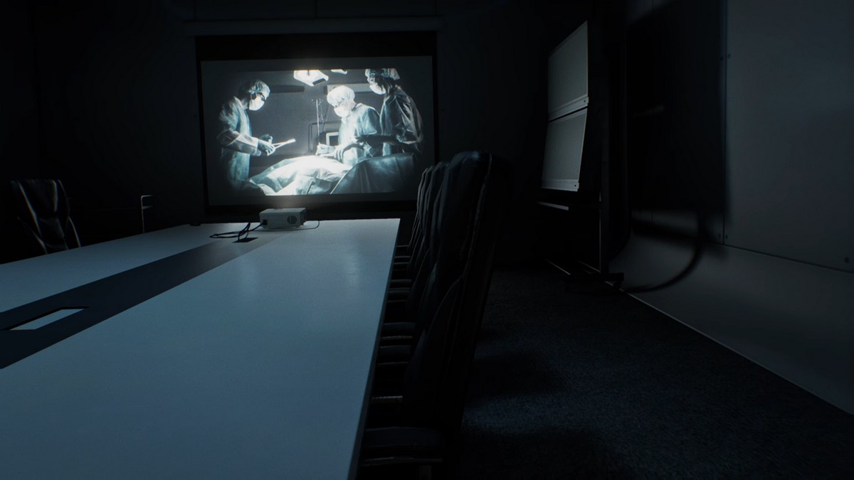 Пройдите через лабораторию и взгляните на документы на столе. Есть только один способ продолжить – войти в конференц-зал. Используйте пульт дистанционного управления рядом с проектором, чтобы переключать слайды. Это запустит кат-сцену, завершив текущую главу и вернув вас к Леону в полицейском участке.
