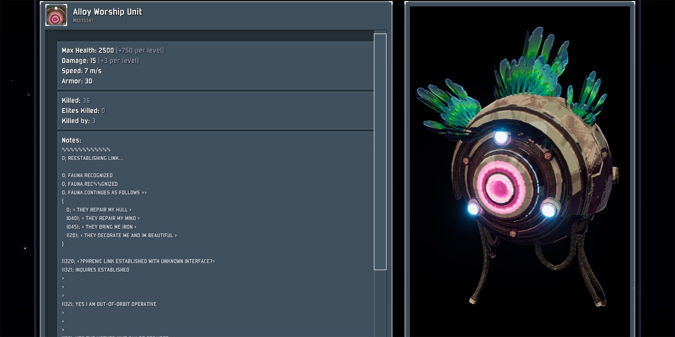 Поскольку подразделение Alloy Worship Unit является воздушным противником, оно представляет собой проблему для выживших в ближнем бою, поскольку они изо всех сил пытаются подобраться ближе. Этот босс обладает двумя атаками и способностью вызывать трех дронов-помощников, известных как Solus Probes. Он может выпустить серию из 12 сфер в сторону игрока или произвести три одновременных взрыва рядом с игроком, одновременно усиливая его щиты на 100% на 6 секунд. Менее грозная версия этого босса, называемая Единицей управления Солусом, может появиться во время событий телепорта, но ей не хватает силы Единицы поклонения сплавам.