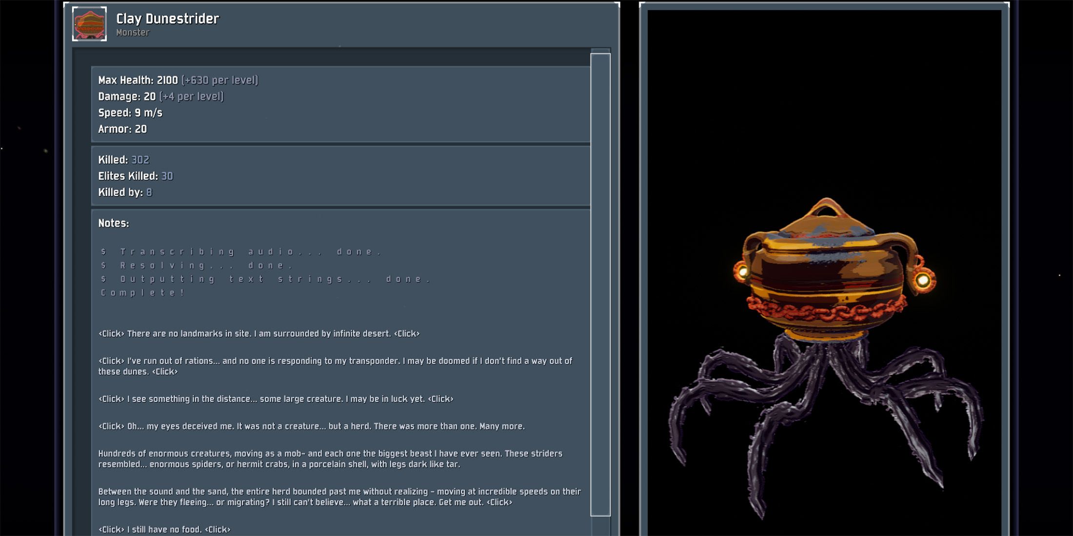Глиняный Дюнный Странник, простое, но грозное существо, украшает различные места, но в основном обитает в Заброшенном Акведуке. Этот грозный противник напоминает высокий глиняный горшок с шестью желеобразными черными ножками, обеспечивающими его опору. Он настойчиво бросает в игрока липкие сферы, которые замедляют его, давая боссу возможность нанести больше атак.